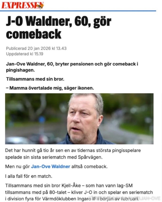 直播吧1月21日讯60岁的瑞典乒乓球名将瓦尔德内尔宣布,自己将复出回到赛场,他将参加瑞典丁级联赛(第四级别)英加略对阵布奥的比赛,代表英加略俱乐部出战。