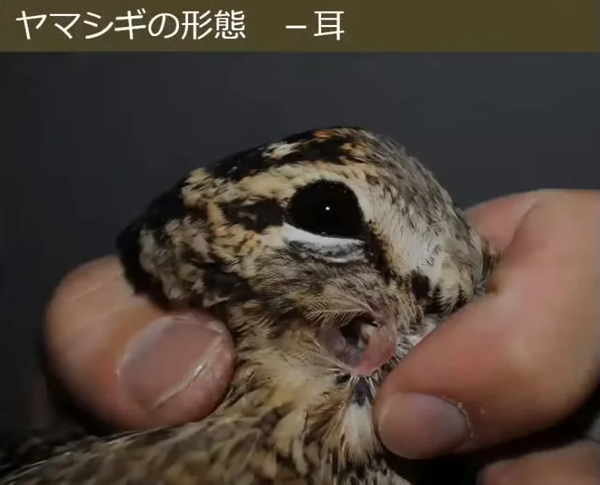 丘鹬的外耳孔,或者说它的耳朵长在了眼睛正下方偏前的区域,几乎到了脸的前端。相比之下,它的近亲扇尾沙锥的耳孔也只是在眼睛下方,而不像丘鹬这样大幅前移。