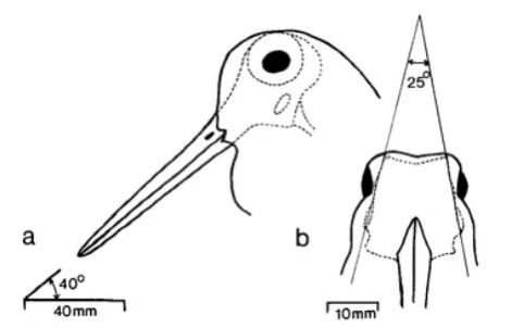 这个离谱的布局,其实是为了保证在把长嘴深深插入泥土觅食时,还能保持足够的视野—丘鹬的眼睛被移到了头顶靠后——这样即使低头干饭也能获得接近360度的视野(p3, by P. Noll),察觉到来自背后和上方的天敌。