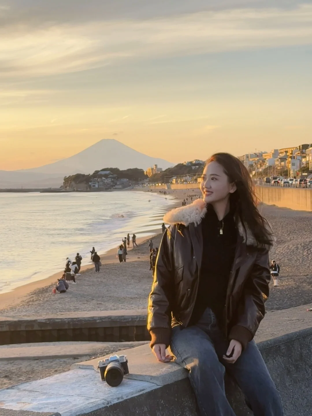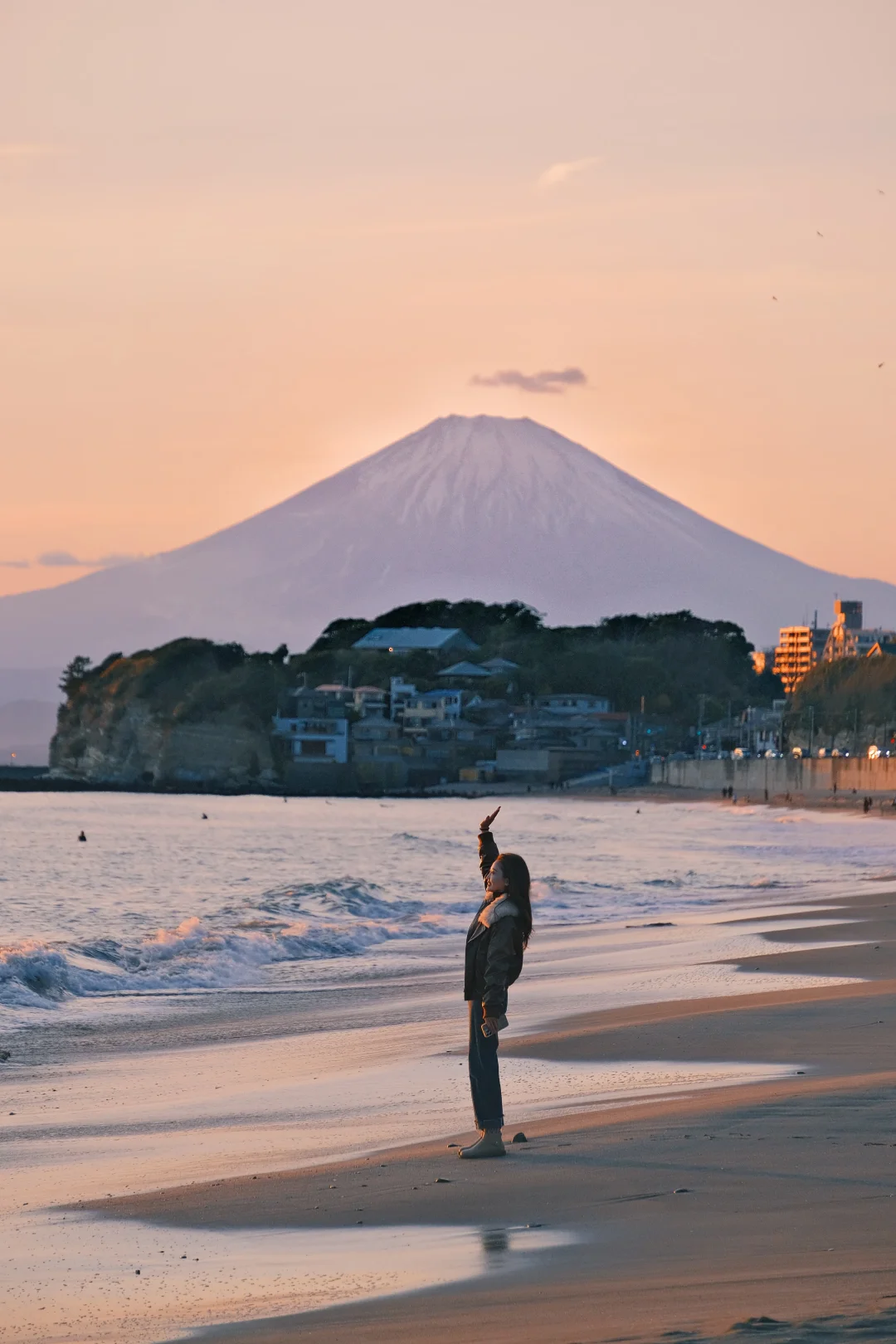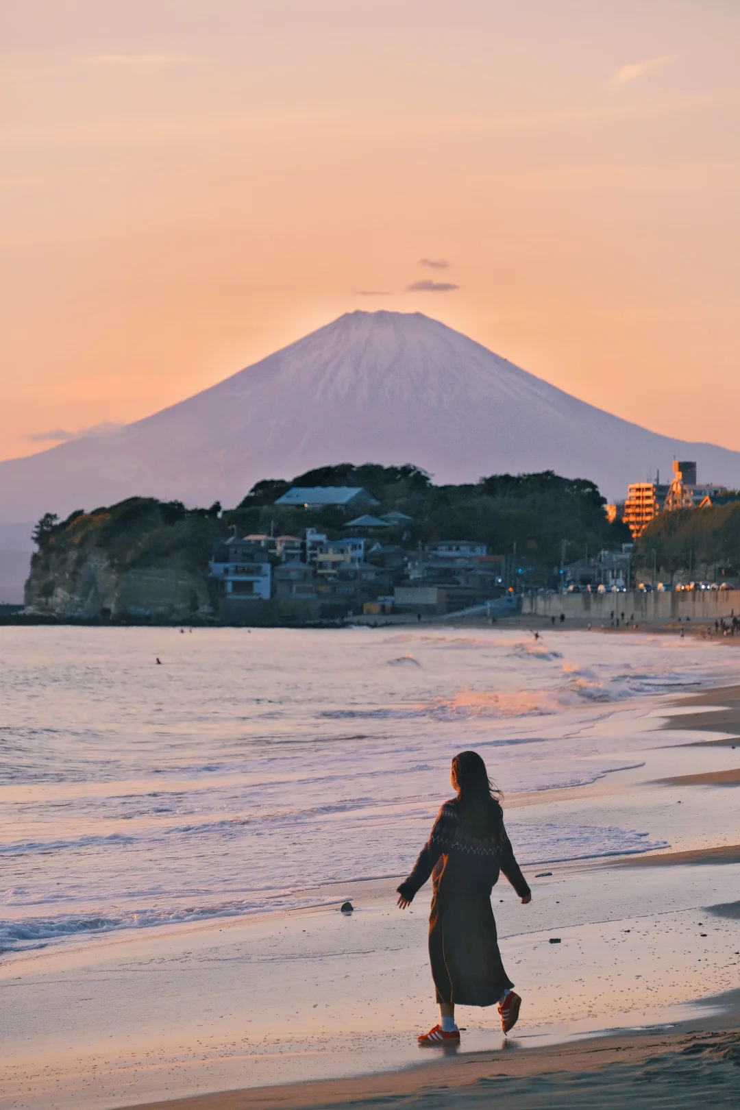 ✅拍完电车机位继续徒步一公里就能到七里滨海滩了,这里有个海堤,可以拍到沙滩和富士山同框的机位!(如果只想去看日出日落的,也可以直接坐江之电到七里滨站下车,出来就是海堤了)