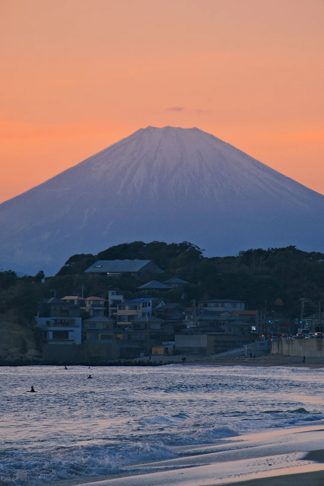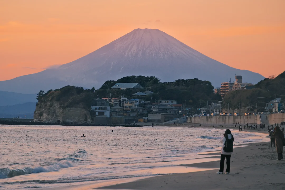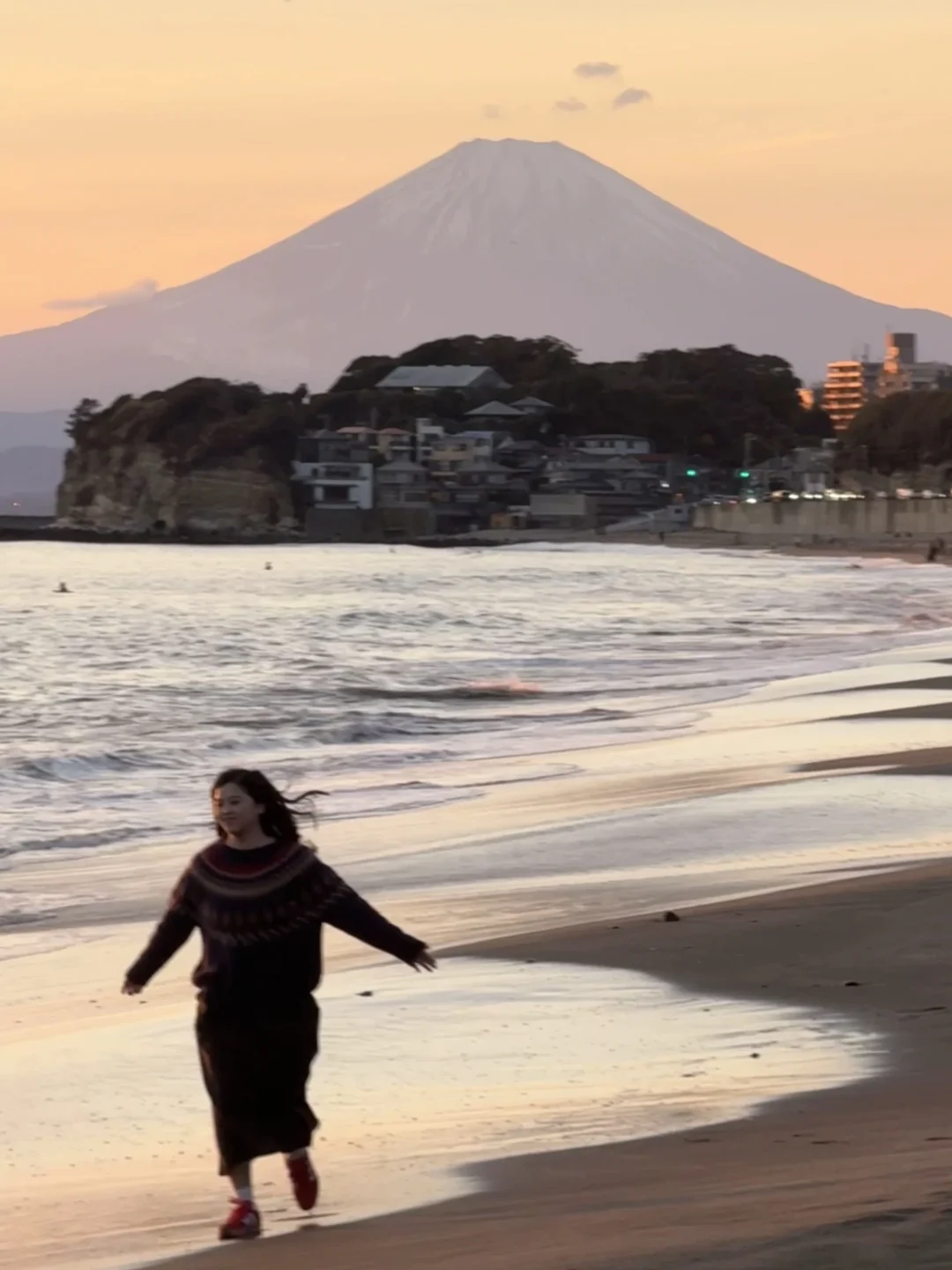 ✅拍完电车机位继续徒步一公里就能到七里滨海滩了,这里有个海堤,可以拍到沙滩和富士山同框的机位!(如果只想去看日出日落的,也可以直接坐江之电到七里滨站下车,出来就是海堤了)