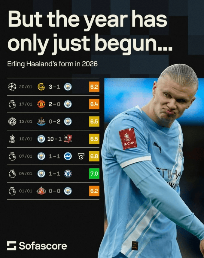 而据sofascore的统计,这位挪威人在进入2026年的7场各项赛事仅是在对阵布莱顿比赛中打进一粒点球,且7场比赛评分最高也只有7分。