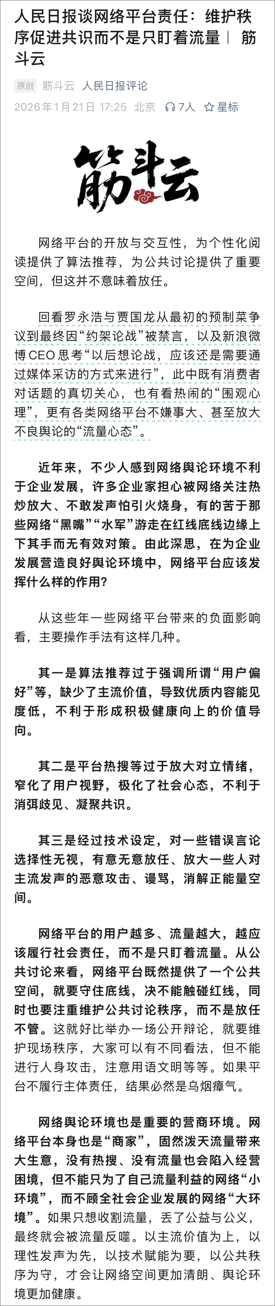 1月21日,人民日报再发评论《人民日报谈网络平台责任:维护秩序促进共识而不是只盯着流量》。