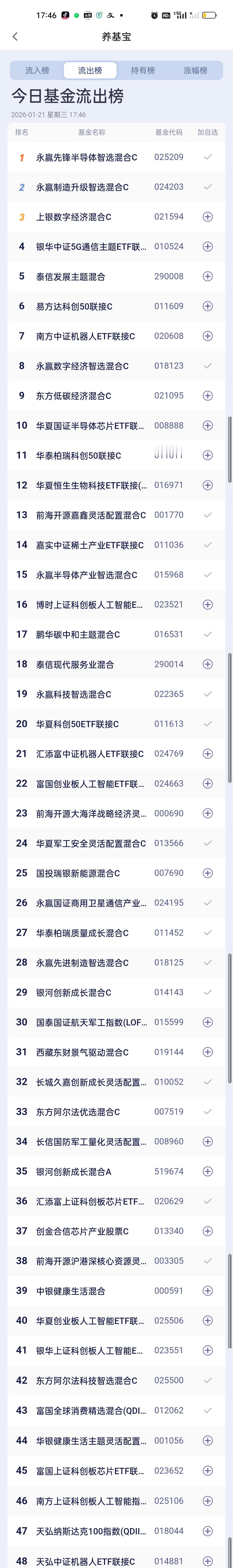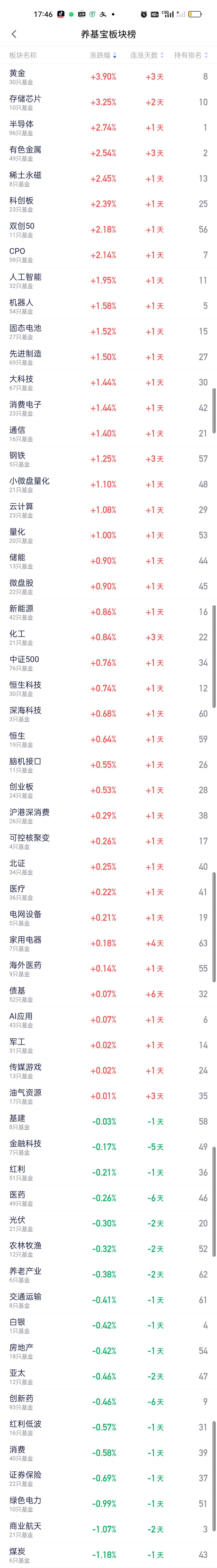 今日基金加仓榜,减仓榜,板块榜和估值榜已全部更新完毕。加仓榜前三名是国投瑞银白银期货,路博迈资源精选股票,华夏黄金ETF联接。减仓榜前三名是永赢先锋半导体,永赢制造升级和上银数字经济。 板块榜方面,涨幅居前的是黄金,存储芯片,半导体,有色金属,稀土永磁,科创板,双创50,CPO,人工智能,机器人,固态电池。跌幅居前的是标普,白酒,海外基金,银行,煤炭,商业航天,绿色电力,证券保险,消费,红利低波,创新药。