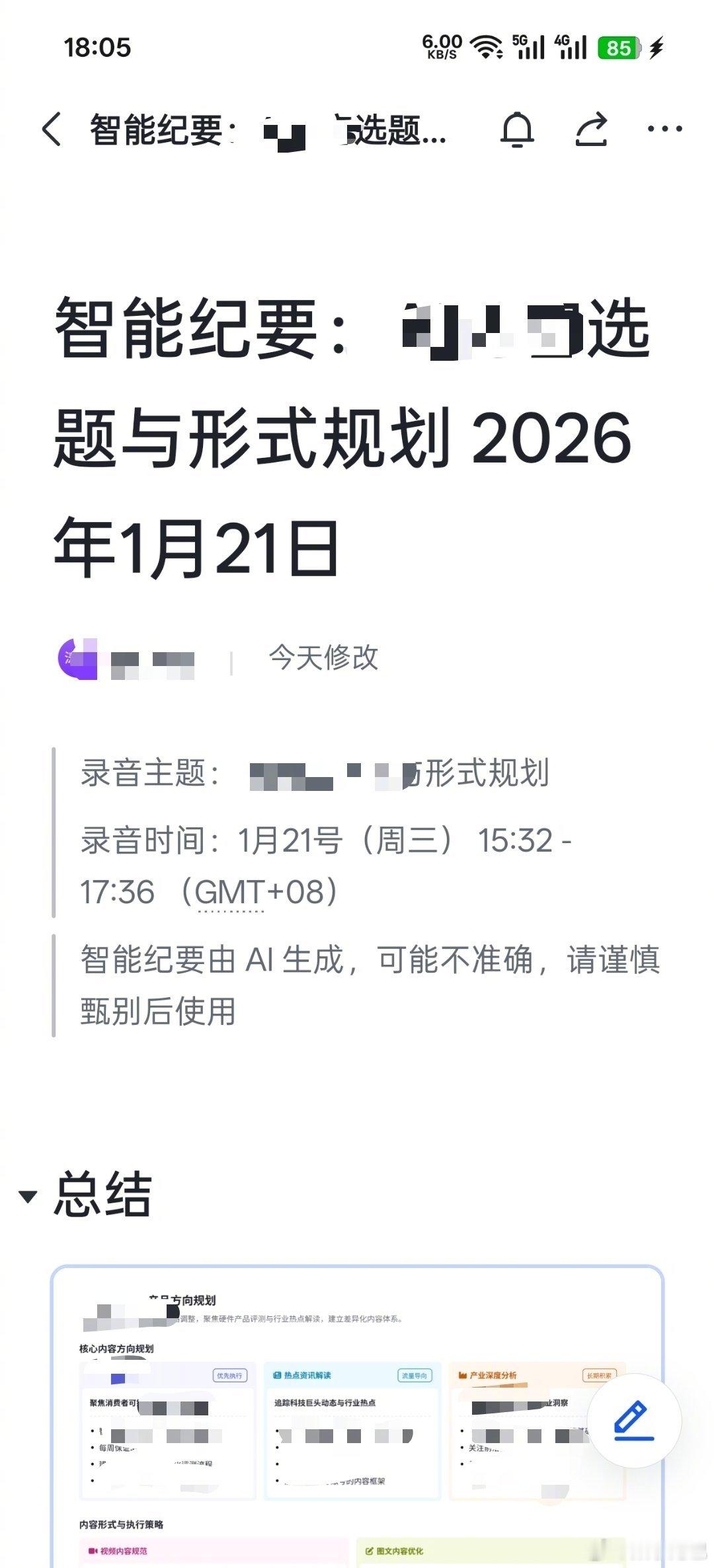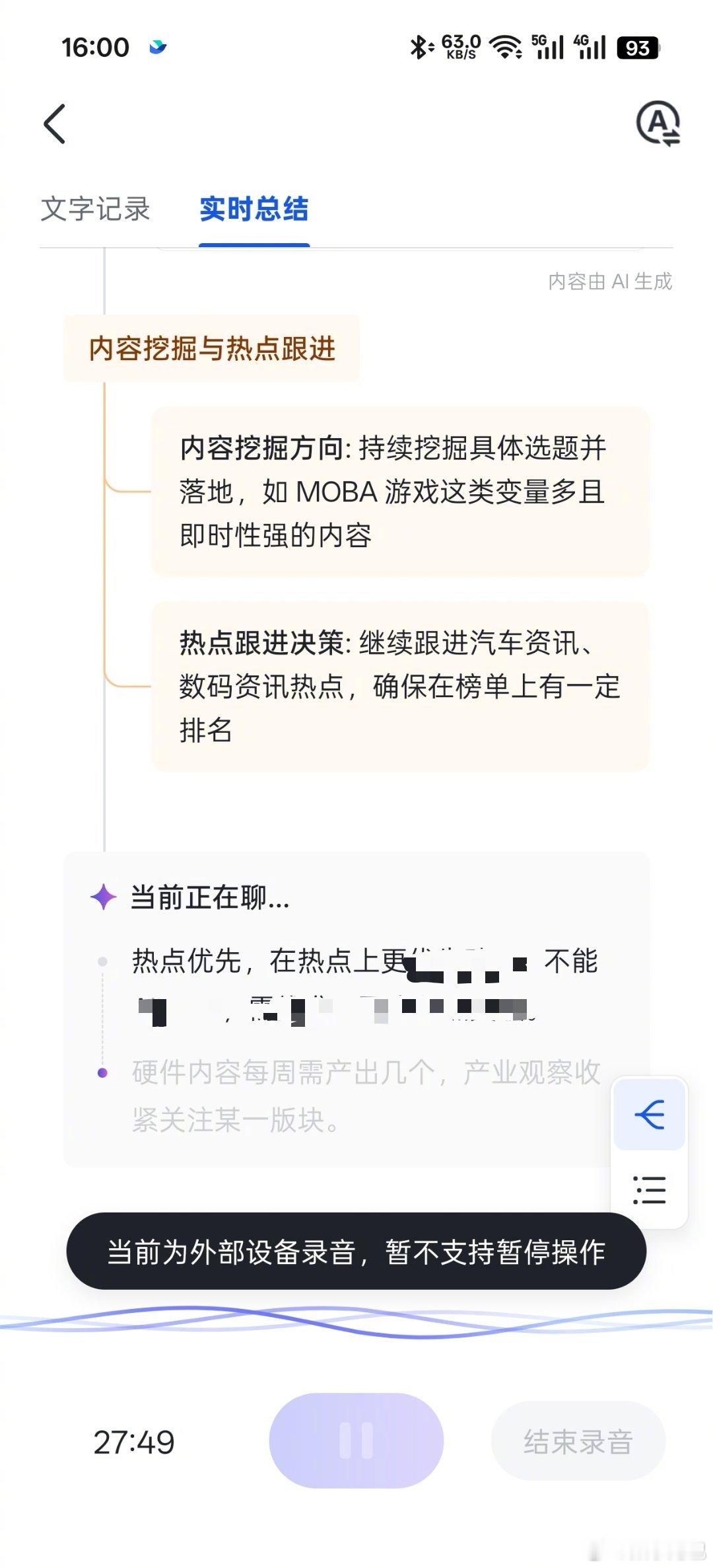 今天实打实尝试了 soundcore Work 这个 AI 录音笔,开了两个小时的会。整体使用下来感觉就是记录的速度很快,而且还会同步跟你生成实时总结导图,对于会议记录来说确实也比手机自带的 AI 助手要强一些。最值得关心的还是在于整场会议讨论内容的准确度问题,从记录的内容来说,我们说出来的内容大部分能完好记录下来,一些重复的话语、语气词会适当去掉,保持内容易读性。但是在一些涉及到专有名词、特殊品牌、行业词汇的时候,或者说同事发音不太清晰的时候,就会有乱写的问题。在会议结束并关掉录音之后,这个 AI 录音笔就会自动把内容同步到手机,然后手机端再继续处理。我们这个 2 小时会议同步和最后处理的时间有点久,整个过程大概十多分钟左右。处理完成后输出的智能纪要,是比较大而全的那种,就是几乎把我们说的所有内容,包括一些偏题的话题,也都收录进来了,要完全看完也都需要时间。不过起码说它会给你做一个总结的画板,后面要是能够更精炼一些,效果应该会更好。参会人员声音区分没有问题,各自的内容和声音记录都对得上。只是我们同时讨论的人并不多,所以对录音笔 AI 识别讨论人的难度也不高。输出的会议总结基本符合我们的实际讨论内容,但在一些人员责任分配、待办事项这些方面准确度不太高,还是需要后期手动修正。只能说它起码帮你解决了会议记录中绝大部分的工作,这个效果还可以接受。最后它还会有一些金句时刻,非常提供情绪价值了。噢对了,还有一点,整场 2 小时会议下来,AI 豆本身耗电 20%,挺耐用的。结尾问一句各位,你们公司开会有这种 AI 录音笔的需求吗?