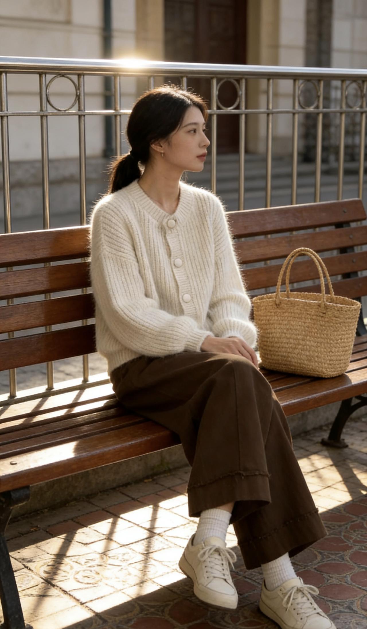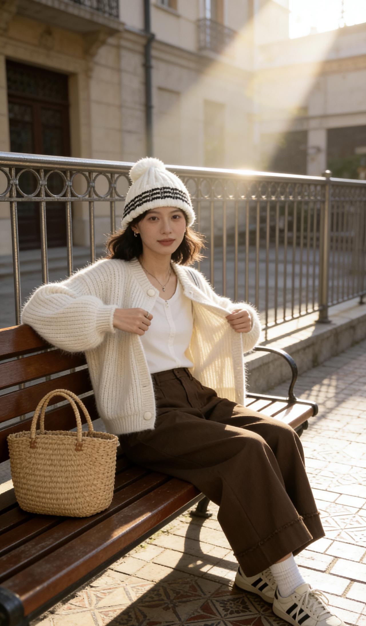 冬日暖阳下,红鞋黑裤的时尚女孩倚靠在蓝护栏旁,背景是绿意盎然的田野。