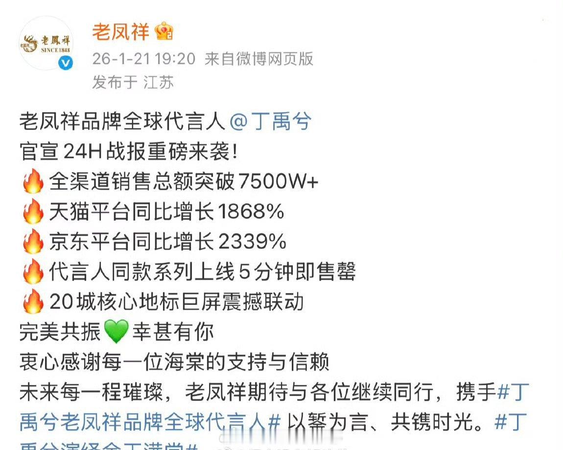 丁禹兮老凤祥首日战报7500w!
