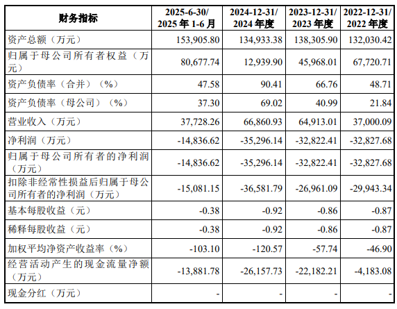 财务方面,于2022年度、2023年度、2024年度及2025年1-6月,公司实现营业收入分别约为3.7亿元、6.49亿元、6.69亿元、3.77亿元人民币;同期,净利润分别为-3.28亿元、-3.28亿元、-3.53亿元、-1.48亿元人民币。