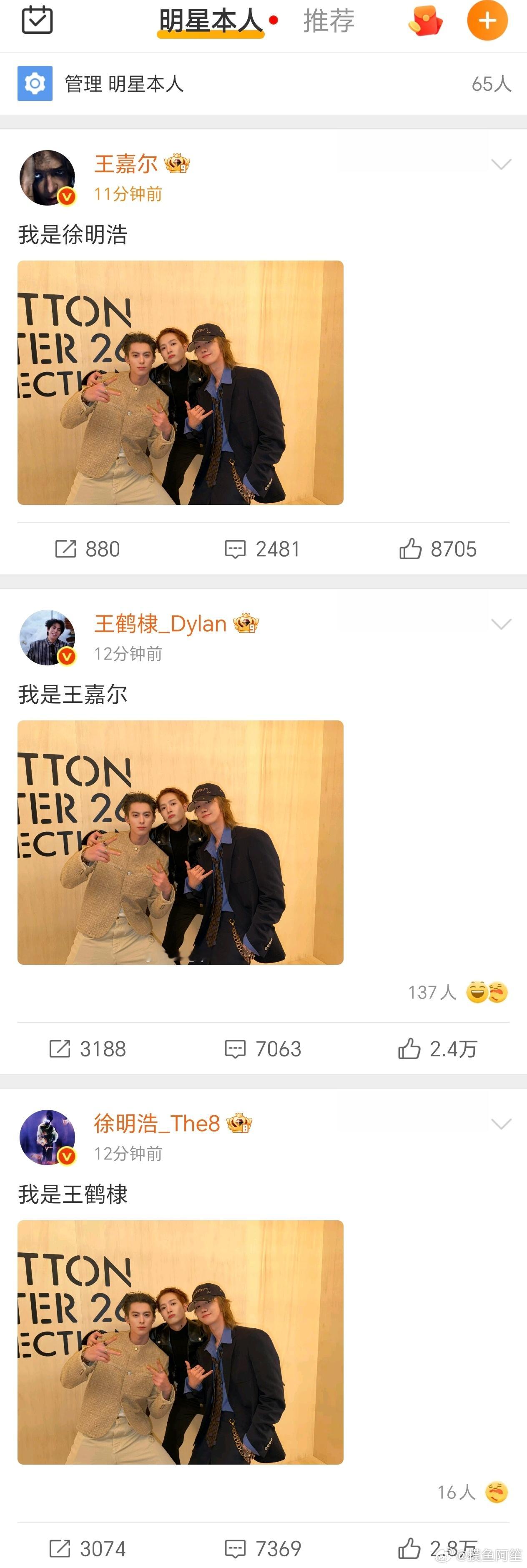疑似中国区lv的三位在玩一种很新颖的介绍方式,首页一溜刷到王嘉尔,王鹤棣,徐明浩的微博也太有意思了,三位都是时尚达人真的可以合作一下 徐明浩 我是王鹤棣 王嘉尔王鹤棣徐明浩到底谁是谁