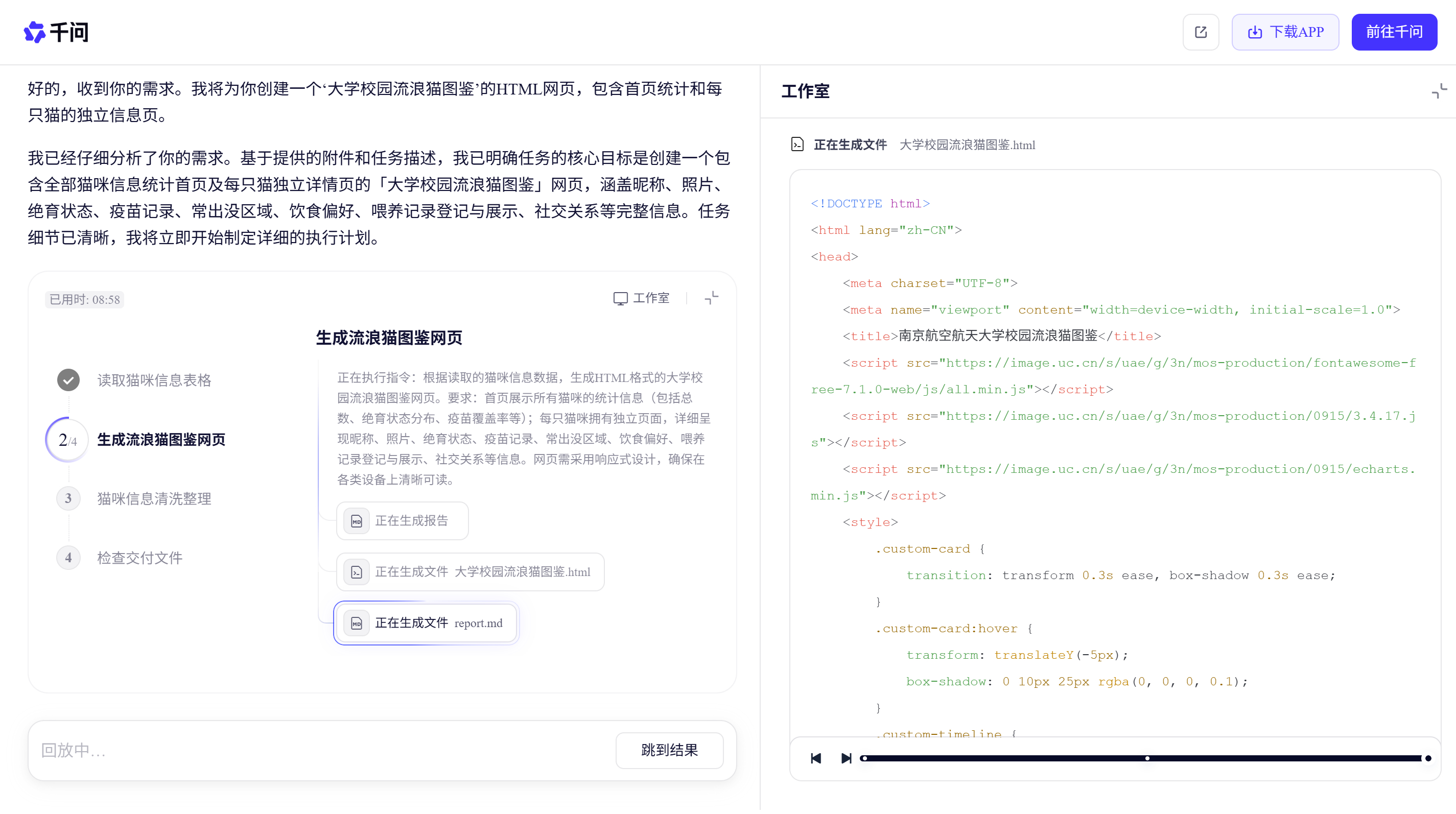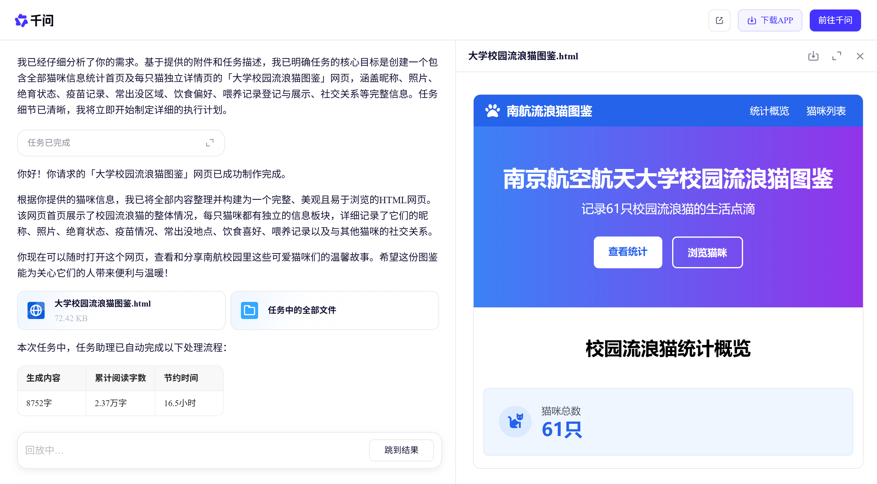 过去,校园流浪猫救助依赖人力奔走与手动记录;如今,志愿者用千问的任务助理一句话就可以搭建专业的图鉴网页,实现信息同步。南航猫协每只猫咪的”电子身份证“,看似简单,却映射出一个可持续的公益模式范本:普通人无需代码基础,也能做出办实事的应用;志愿者、捐助者、领养人基于同一份网页分工协作,节约下了大量人力财力。千问AI让每一份小而美的善意,都能落地生长~千问给流浪猫办了电子身份证千问上线能干活的任务助理自由的小猫不叫流浪猫