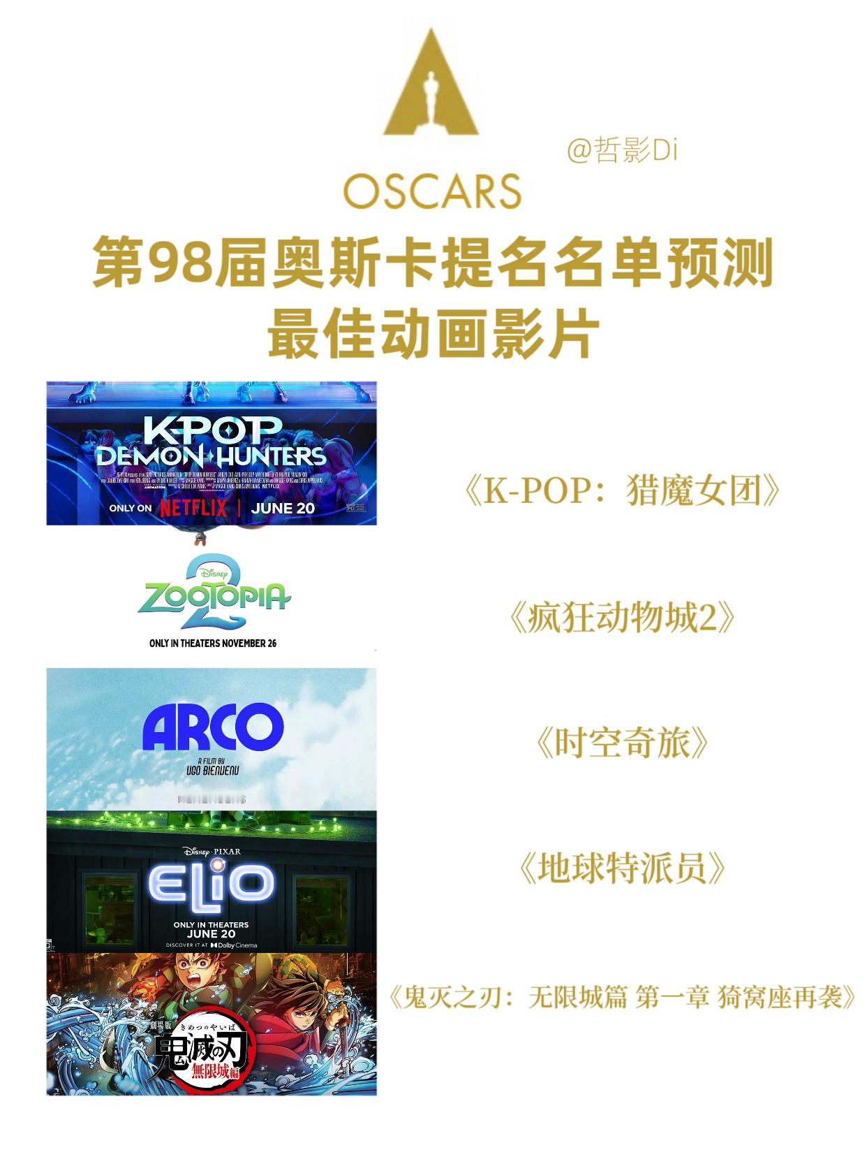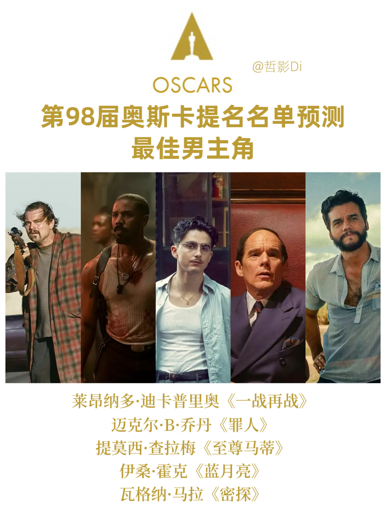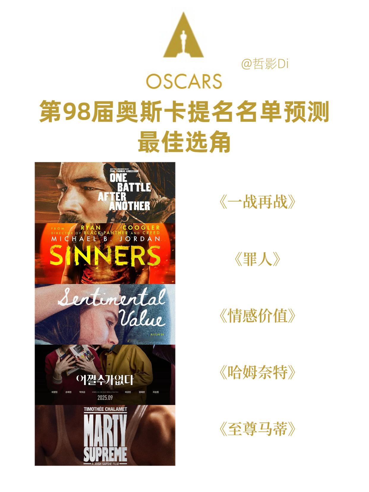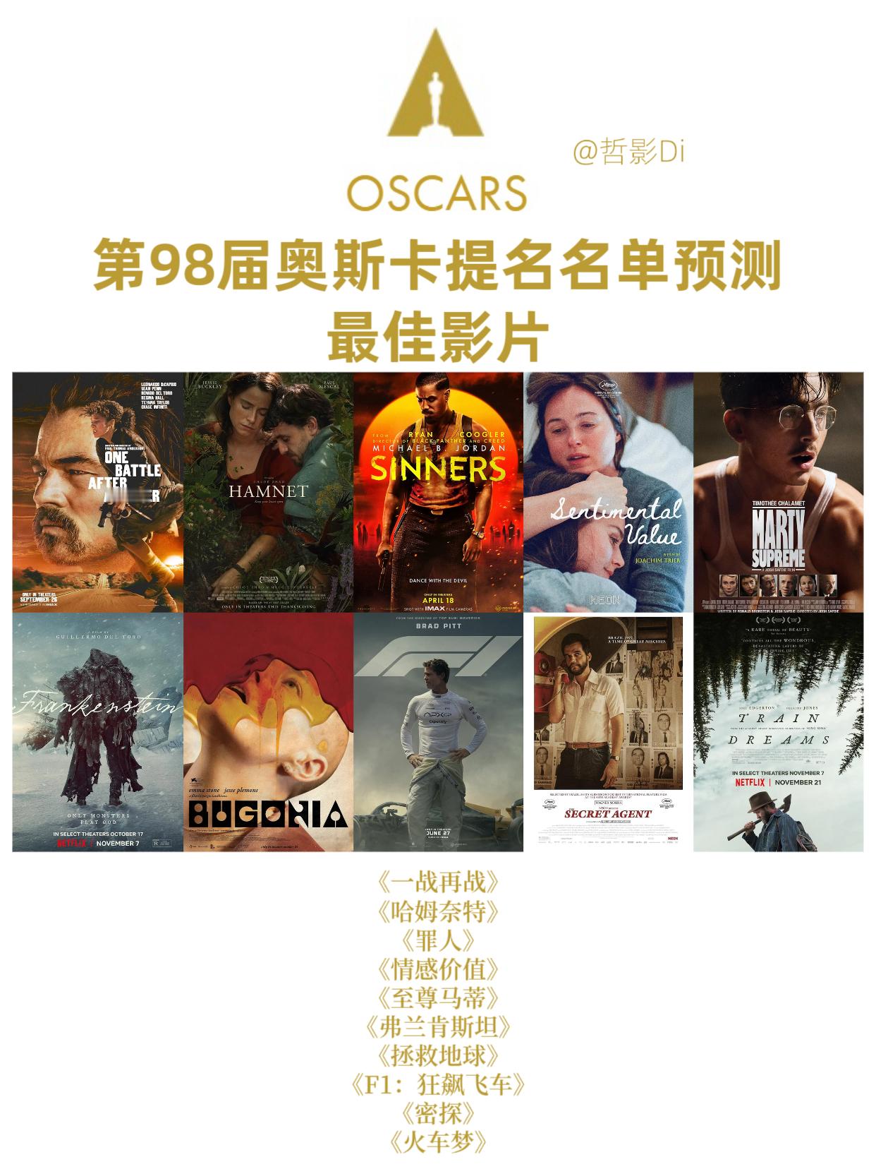 第98届奥斯卡提名北京时间明晚发布,按照惯例预测一下明天发布的其中9个奖项的提名名单,看看👀最终能猜中多少🎬最佳影片《一战再战》《哈姆奈特》《罪人》《情感价值》《至尊马蒂》《弗兰肯斯坦》《拯救地球》《F1:狂飙飞车》《密探》《火车梦》📹最佳导演保罗·托马斯·安德森《一战再战》赵婷《哈姆奈特》瑞恩·库格勒《罪人》约阿希姆·提尔《情感价值》乔什·萨弗迪《至尊马蒂》🎭最佳男主角莱昂纳多·迪卡普里奥《一战再战》迈克尔·B·乔丹《罪人》提莫西·查拉梅《至尊马蒂》伊桑·霍克《蓝月亮》瓦格纳·马拉《密探》🎭最佳女主角杰西·巴克利《哈姆奈特》萝丝·拜恩《如果有腿,我会踢你》雷娜特·赖因斯夫《情感价值》蔡斯·英菲尼迪《一战再战》艾玛·斯通《拯救地球》🎭最佳男配角本尼西奥·德尔·托罗《一战再战》西恩·潘《一战再战》斯特兰·斯卡斯加德《情感价值》雅各布·艾洛蒂《弗兰肯斯坦》保罗·麦斯卡《哈姆奈特》🎭最佳女配角埃米·马迪根《凶器》缇雅娜·泰勒《一战再战》爱莉安娜·格兰德《魔法坏女巫2》英加·伊布斯多特·莉莉亚斯《情感价值》乌米·马萨库《罪人》🎭最佳选角《一战再战》《罪人》《情感价值》《哈姆奈特》《至尊马蒂》🎬最佳国际影片《密探》(巴西)《普通事故》(法国)《情感价值》(挪威)《无可奈何》(韩国)《欣德·拉贾布之声》(突尼斯)🦄最佳动画影片《K-POP:猎魔女团》《疯狂动物城2》《时空奇旅》《地球特派员》《鬼灭之刃:无限城篇 第一章 猗窝座再袭》