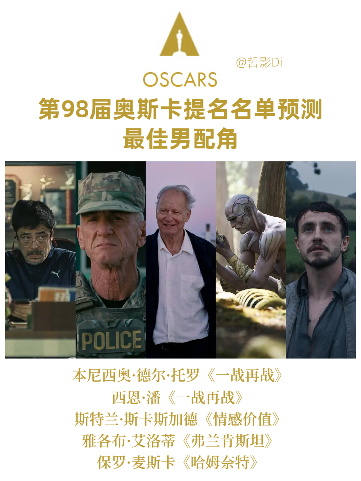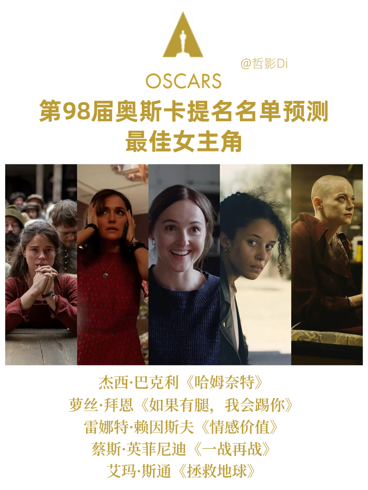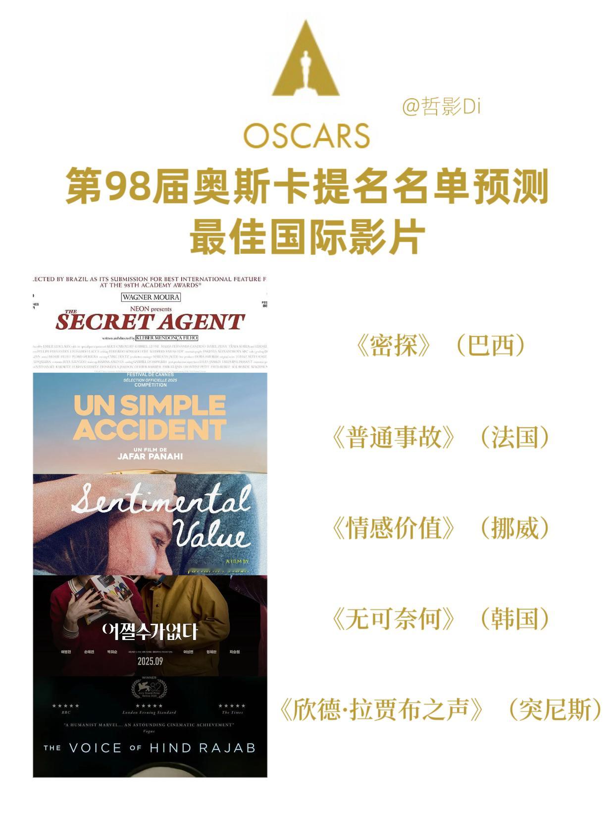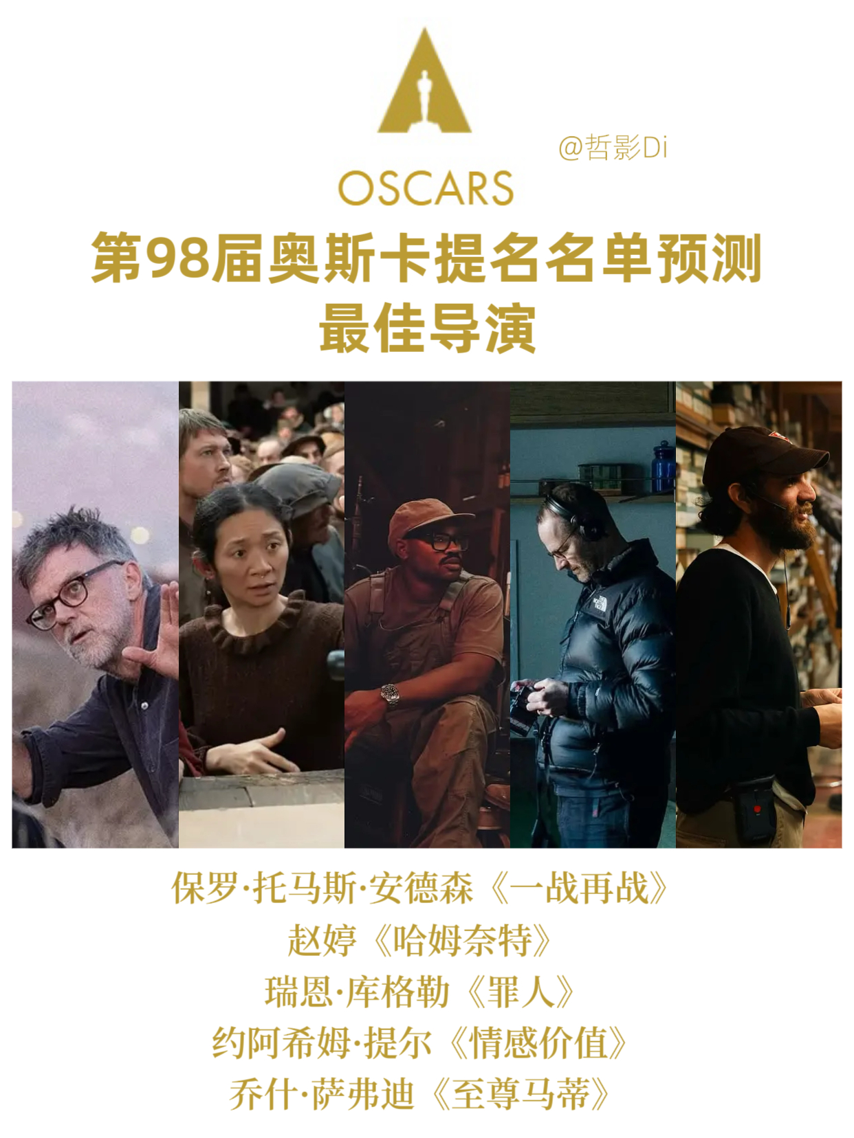 第98届奥斯卡提名北京时间明晚发布,按照惯例预测一下明天发布的其中9个奖项的提名名单,看看👀最终能猜中多少🎬最佳影片《一战再战》《哈姆奈特》《罪人》《情感价值》《至尊马蒂》《弗兰肯斯坦》《拯救地球》《F1:狂飙飞车》《密探》《火车梦》📹最佳导演保罗·托马斯·安德森《一战再战》赵婷《哈姆奈特》瑞恩·库格勒《罪人》约阿希姆·提尔《情感价值》乔什·萨弗迪《至尊马蒂》🎭最佳男主角莱昂纳多·迪卡普里奥《一战再战》迈克尔·B·乔丹《罪人》提莫西·查拉梅《至尊马蒂》伊桑·霍克《蓝月亮》瓦格纳·马拉《密探》🎭最佳女主角杰西·巴克利《哈姆奈特》萝丝·拜恩《如果有腿,我会踢你》雷娜特·赖因斯夫《情感价值》蔡斯·英菲尼迪《一战再战》艾玛·斯通《拯救地球》🎭最佳男配角本尼西奥·德尔·托罗《一战再战》西恩·潘《一战再战》斯特兰·斯卡斯加德《情感价值》雅各布·艾洛蒂《弗兰肯斯坦》保罗·麦斯卡《哈姆奈特》🎭最佳女配角埃米·马迪根《凶器》缇雅娜·泰勒《一战再战》爱莉安娜·格兰德《魔法坏女巫2》英加·伊布斯多特·莉莉亚斯《情感价值》乌米·马萨库《罪人》🎭最佳选角《一战再战》《罪人》《情感价值》《哈姆奈特》《至尊马蒂》🎬最佳国际影片《密探》(巴西)《普通事故》(法国)《情感价值》(挪威)《无可奈何》(韩国)《欣德·拉贾布之声》(突尼斯)🦄最佳动画影片《K-POP:猎魔女团》《疯狂动物城2》《时空奇旅》《地球特派员》《鬼灭之刃:无限城篇 第一章 猗窝座再袭》
