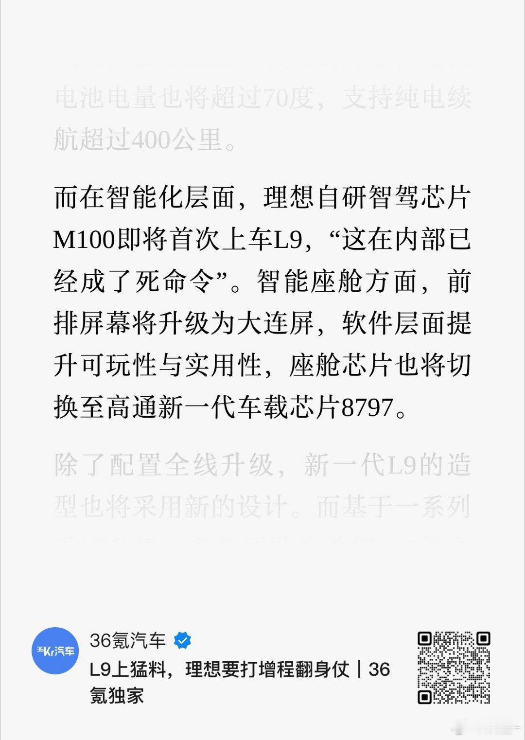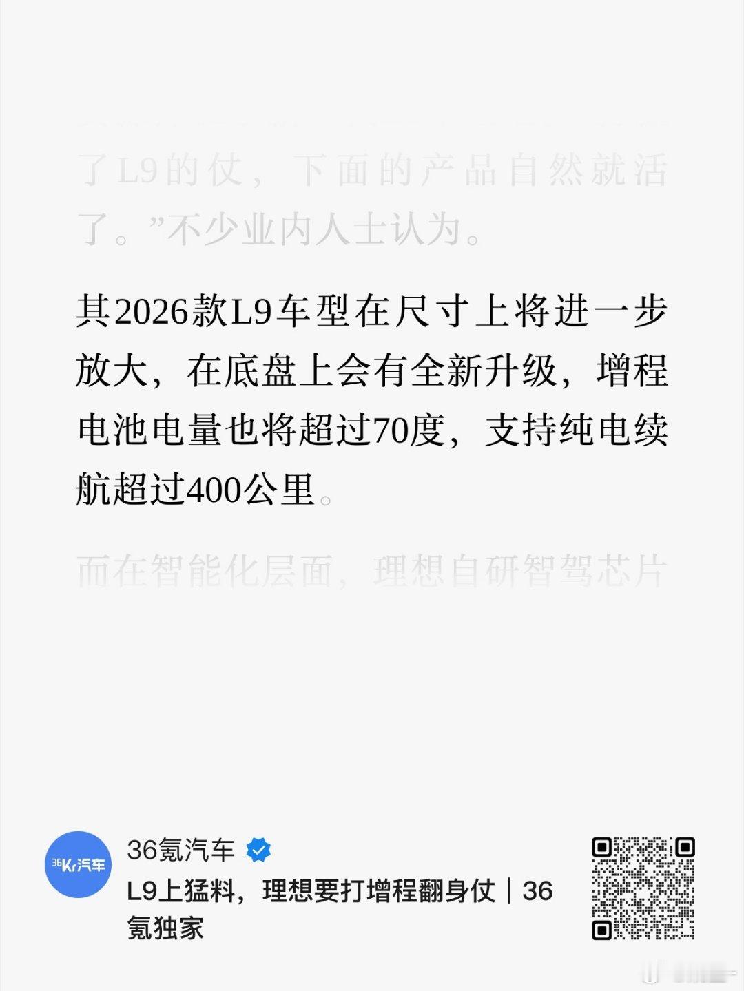 2026增程SUV市场第一之争39氪汽车消息,理想2026年将“重新聚焦于增程”,回归增程基本盘,理想L9将作为重点车型更新换代尺寸放大,底盘升级,全新外观70度增程大电池,纯电续航将400km+自研智驾芯片M100上车,座舱升级8797芯片现在的增程SUV市场也越来越卷了,兄弟们觉得作为老大哥的理想,能不能守住这个基本盘?理想汽车理想l9大v聊车