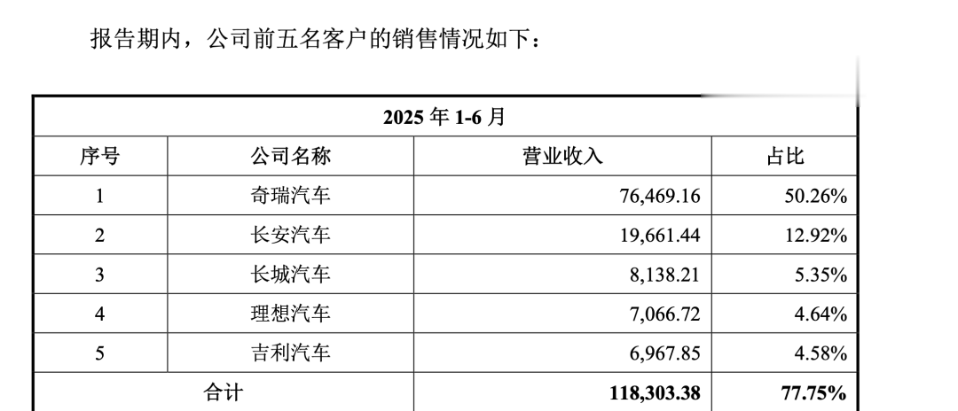 招股书中公布的埃泰克前五名客户销售情况,2022年至2025年上半年,奇瑞汽车对公司的营业收入占比由27.6%上升至50.26%,所占应收账款比例则由32.51%提升至55.94%。