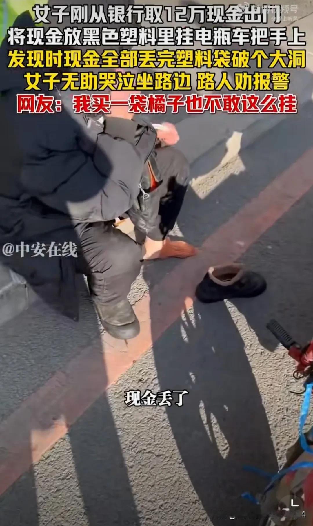 这心是有多大啊!今日辽宁一大姐,从银行取了11.6万的现金,用一个黑色薄塑料袋一兜,直接挂在了电动车把手上,直到目的地才发现,塑料袋破了个大洞,里面的钱全没了! 视频中,大姐坐在地上崩溃痛哭,一只鞋丢在一边都不知道穿,所骑电动车破破烂烂的,看起来家里条件也不好。 真想不通她咋想的?就算电视剧看多了,为了掩饰,可11.6万现金也有四五斤了,你就不能找个结实点的袋子,放车篓也行啊!偏偏挂车把上,谁知道是掉哪里了,还是被偷了呢? 网友:说你在乎把,你用个破塑料袋,说你不在乎吧,丢了你嚎啕大哭!心真不是一般的大! 您觉得这大姐到底咋想的?
