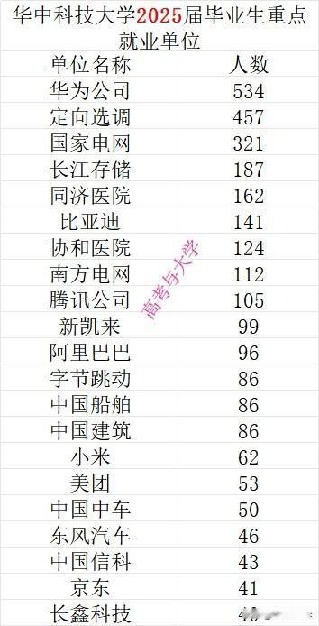 就业华为534人,华中科大2025届毕业生主要就业去向出炉。 华科俗称南方小清华,实力确实很强,作为电气二龙四虎高校/985/211之一 2025年就业TOP10单位比2024年增加接近600人。其中 华为公司534人,比2024增加115人 定向选调457人,比2024年增加20人 国家电网321人,比2024年增加83人 长江存储187人,比2024年增加104人 比亚迪141人,比2024年增加38人 协和医院124人,比2024年增加40人 腾讯公司105人,比2024年增加23人 在就业难的大环境下,华科的就业质量依然很高,一年比一年好,可喜可贺。 高考 华中科技大学 武汉 华中科技大学很难考吗