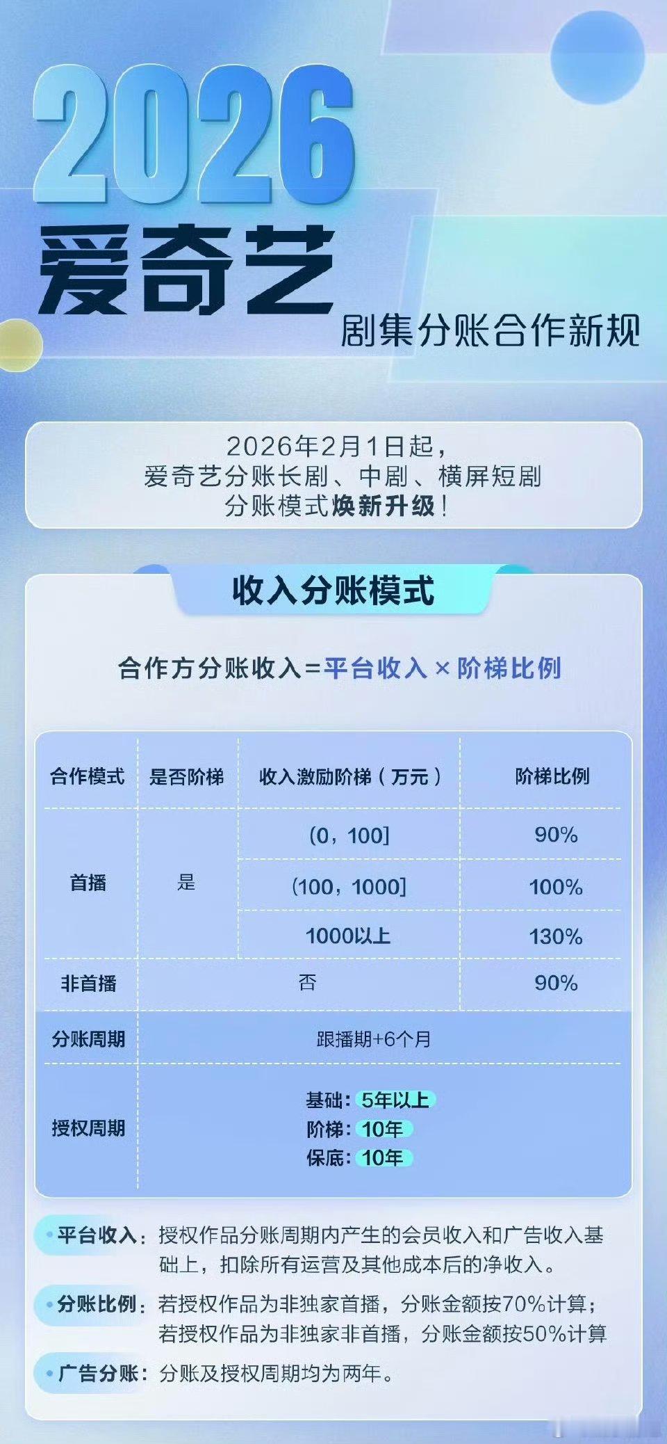 爱奇艺实行收入分账模式 爱奇艺2026年2月1日开始全面实行“收入分账”的创新合作模式,促进行业健康发展。根据新规,所有内容合作方将统一以“平台收入×分成比例”为核心计算方式获得收益。2025微博之夜爆款创作大赛