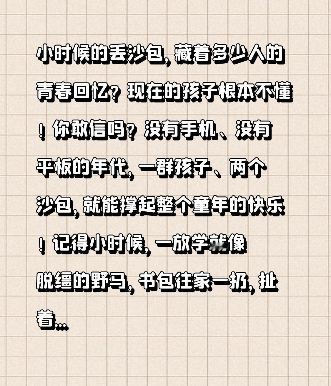 小时候的丢沙包,藏着多少人的青春回忆?现在的孩子根本不懂! 你敢信吗?没有手机、没有平板的年代,一群孩子、两个沙包,就能撑起整个童年的快乐! 记得小时候,一放学就像脱缰的野马,书包往家一扔,扯着嗓子喊一句“丢沙包咯”,不出五分钟,巷口就能凑齐十几号人。我们分成两队,中间站三五个“守方”,两边各站两个“攻方”,沙包一飞,整个场子瞬间沸腾。有人灵活躲闪像只小猴子,有人奋不顾身去接沙包,就为了给队友挣一次“复活”的机会,还有人被砸中时故意装哭,逗得大家哈哈大笑。 最有意思的是那次转折——我明明被沙包砸中了胳膊,却死活不承认,蹲在地上耍赖说“没碰到!就是没碰到!”。攻方的小胖急得直跺脚,非要拉我起来看衣服上的灰印,结果争执间,他自己不小心把沙包扔出了界,反而让我们队多了一次进攻机会。后来才知道,小胖其实早就看出我耍赖,却故意让着我,因为他知道那天是我生日。现在想想,那些吵吵闹闹的瞬间,没有输赢,只有纯粹的开心。 不像现在的孩子,放假就抱着电子产品,对着屏幕傻笑,我们当年的快乐简单又实在。丢沙包砸中的不仅是奔跑的身影,更是肆无忌惮的童年;接住的不只是小小的沙包,还有伙伴们最真挚的情谊。累了就坐在台阶上分享零食,渴了就喝一口从家里带的凉白开,聊不完的悄悄话,说不尽的小秘密,都藏在那飞在空中的沙包里。 如今巷口再也凑不齐当初的伙伴,我们都长成了为生活奔波的大人,偶尔路过小学操场,看到孩子们在玩新的游戏,才突然发现,原来最怀念的不是丢沙包本身,而是那种不用顾虑太多、可以尽情撒欢的时光,是那些一起疯、一起闹、一起长大的人。 你小时候最喜欢玩丢沙包吗?有没有什么难忘的经历?评论区聊聊,看看谁的童年更精彩!
