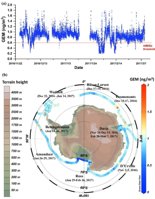 图:中国第33次南极科考期间大气零价贡浓度的时间序列(a)及环南极空间分布图(b)