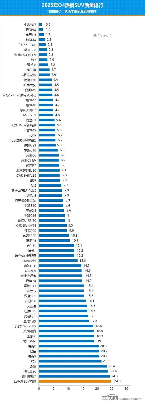 小米YU7获得SUV质量排名第一数据不会骗人,车质网最新统计里,小米YU7的投诉销量比只有万分之0.9,这成绩在三百多款SUV里拿第一,确实硬核之前看雷总自己拆车、媒体也拆,就觉得这车底子挺实在。现在回头看,那种“敢给你看里子”的底气,到底还是转化成了车主的低投诉和好口碑。上市半年,连续五个月销量在中大型SUV里领先,卖得好还问题少,说真的能把品控做到这个程度,挺让人服气。有时候承认别人优秀没那么难,至少这份榜单是车主真真实实用体验投出来的。国产车越来越稳,难道不是好事吗