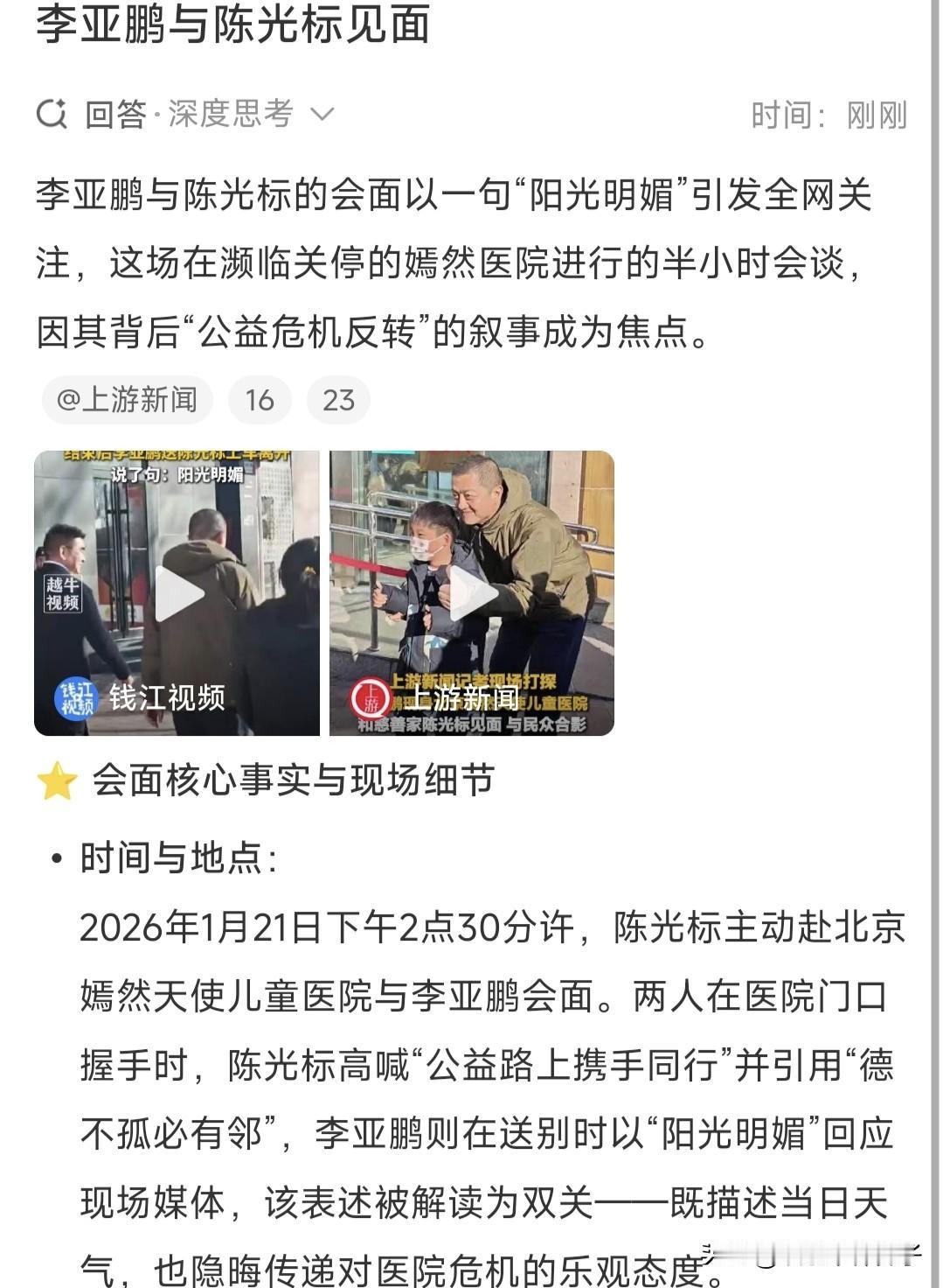 李亚鹏与陈光标碰面,笑容十分灿烂,公益路上携手同行! 今天是个好日子,李亚鹏开心,网友也跟着高兴。 媒体问李亚鹏心情怎么样,他笑着说:“阳光明媚”,看得出来,发自内心的高兴,眼里有光了,不再愁容满面。 陈光标握着李亚鹏的手,说:“公益路上携手同行”,这画面让人觉得心里暖暖的。 一些网友纷纷表示:都是公益达人,聚在一起非常放心。 虽然不知道两人此次碰面,能否帮嫣然天使医院渡过难关,也不知道,会碰撞出怎样的火花。 至少,李亚鹏在公益的道路上,不用一个人孤单前行了!