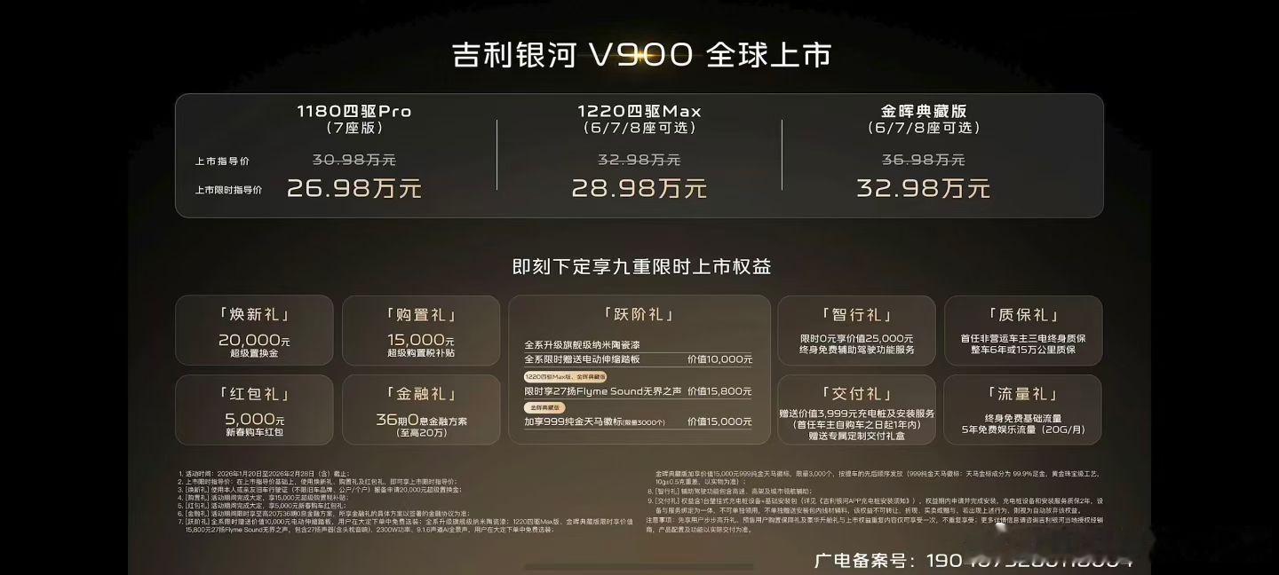 吉利银河v900 颤抖吧!26.98万起标配激光雷达+四驱 吉利银河V900重塑MPV市场规则当30万级汽车市场还在为“选智能还是选性能”争论不休,当MPV车型仍被贴上“司机专属”“操控短板”的标签,吉利银河用一款颠覆性产品给出了答案。1月20日,“AI全场景家庭旗舰MPV”吉利银河V900全球上市,以26.98万-32.98万元的限时指导价,携“全系标配激光雷达+双电机四驱”的硬核配置,强势闯入高端MPV战局。这不仅是吉利银河豪华V系列的开篇之作,更是对行业固有规则的全面打破——它证明了高端智能与强悍性能无需高价买单,家庭MPV也能兼具“坐得豪华”与“开得尽兴”的双重体验。一、价格屠夫+配置王者:26.98万起的“降维打击”在当前30万级新能源市场,“标配即豪华”早已成为稀缺品质。智界R7将激光雷达作为中高配车型专属,特斯拉Model Y全系未搭载激光雷达,极氪7X则需额外选装高阶智驾硬件,而吉利银河V900直接将激光雷达纳入全系标配清单,配合双电机四驱系统,以26.98万的起售价,完成了对同级竞品的“降维打击”。这种配置诚意,源于吉利银河对用户需求的深刻洞察。根据麦肯锡《2025中国汽车消费者洞察》,30万级用户已从“为绿牌买单”转向“考核技术全维体验”,高阶智驾与动力性能成为核心决策点。银河V900搭载的千里浩瀚辅助驾驶H5方案,依托前向激光雷达+全维感知硬件,实现行业领先的车位到车位无图NOA,无论是城市复杂路况还是高速长途通勤,都能提供“全国都能去,有路就能开”的从容体验;而全系标配的智能双电机四驱系统,可输出340kW峰值功率与523N·m峰值扭矩,零百加速仅需6.5秒,彻底终结了MPV“动力孱弱”的刻板印象。更值得称道的是,这份硬核配置并未以牺牲实用性为代价。银河V900凭借行业尺寸最紧凑的“超级AI增程系统”与“叠竖”布局,省下150mm纵向空间,打造出全球首创的“三个1000+”空间:二排纵向空间超1000mm、三排纵向空间超1000mm、后备箱容积1100L,91.8%的得房率冠绝全球,让身高两米的乘客也能在第三排惬意舒展,15个20寸行李箱的装载能力完全满足大家庭出行需求。这种“性能、智能、空间”三者兼得的产品力,在同价位段几乎无出其右。二、技术赋能:从“能开”到“好开”的MPV革命长期以来,MPV车型始终面临“舒适与操控不可兼得”的行业难题——为保障后排舒适性,往往牺牲驾驶乐趣,沦为“专职司机车”。但吉利银河V900深知,30万级MPV用户多为高净值家庭,既需要满足全家出行的舒适需求,也追求自身的驾驶愉悦感。为此,银河V900集结全球技术资源,完成了一场针对MPV驾驶体验的彻底革命。其核心底气来自双电机四驱系统与路特斯调校的黄金组合。智能双电机四驱不仅带来强劲动力,更能根据路况实时分配扭矩,在雨雪湿滑路面提供更稳定的抓地力,让大车也能拥有灵活的操控响应;而由路特斯团队操刀的AI数字底盘,搭载主动魔毯预瞄、空气悬挂与CCD连续可变阻尼减振器,可毫秒级调节悬架软硬度,既能过滤路面颠簸带来“魔毯级”舒适体验,又能在弯道中抑制车身侧倾,实现“大车开出小车感”的驾驶乐趣。这种“坐得高级,开得豪华”的双重体验,正是银河V900与传统MPV的本质区别。智能科技的加持让驾驶更具底气。激光雷达赋予的全维感知能力,配合AI大模型驱动的辅助驾驶系统,不仅能精准识别300+种车位类型,实现30秒高效泊入,成功率超99%,更能在复杂路况下主动避险,让新手也能从容驾驭大型MPV。而超级AI增程系统带来的1220km最大续航、18分钟快充与3.77kWh/L的行业顶级油电转化率,彻底解决了长途出行的里程焦虑,让驾驶乐趣无需为续航妥协。三、全维守护+情感智能:重新定义家庭MPV的豪华标准真正的豪华,不止于看得见的配置堆砌,更在于对每一位家庭成员的细致呵护。吉利银河V900以“三排安全平权”与“全域情感智能”为核心,重新定义了家庭MPV的豪华内涵。在安全层面,银河V900堪称“移动的安全堡垒”。采用76.6%高强度钢占比的“星甲车身”,局部运用2000MPa军工级钢材,配合133mm超厚十宫格铝制门槛梁与全球最多11处环抱气囊,构建起全方位被动安全防护。更值得关注的是,它通过了行业首次MPV超国标魔鬼三连碰测试——超国标20%电池托底碰撞、50km/h追尾碰撞、超国标44%的Z字夹击极限碰撞,在极限“叠加伤害”后仍能保持三排乘员生存空间。针对MPV第三排安全薄弱的行业痛点,银河V900采用高强度钢骨架与“管框式全金属背板”设计,承受拉力高出国标20%,彻底终结了“第三排是安全死角”的担忧。在舒适与智能层面,银河V900将“家”的温暖搬进座舱。11层云感SPA Nappa真皮座椅,一二排配齐通风、加热、按摩功能,三排也标配通风与加热,让每位乘员都能享受同等舒适;27扬声器Flyme Sound无界之声系统、后排娱乐巨幕与-6℃~50℃超宽温域冷暖箱,打造沉浸式移动生活空间;双层夹胶静音玻璃与主动降噪技术,营造图书馆级静谧环境,配合智能新风系统与负氧离子发生器,守护老人孩子的呼吸健康。而银河Flyme Auto 2新一代AI智能座舱搭载的超拟人情感智能体Eva,具备情感识别与记忆能力,能主动理解驾乘需求,让智能不止于冰冷的指令响应,更有温情的人文关怀。结语:以颠覆者姿态,开启家庭MPV新时代吉利银河V900的上市,无疑给竞争激烈的30万级市场投下了一颗“重磅炸弹”。26.98万起的价格,却标配激光雷达、双电机四驱、空气悬
