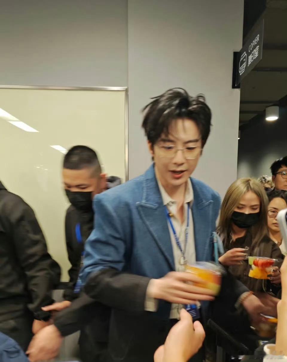 刘宇宁来广州上班了蓝西装搭工牌超有精英范儿,还笑着发水果,这神仙同事谁不想拥有,