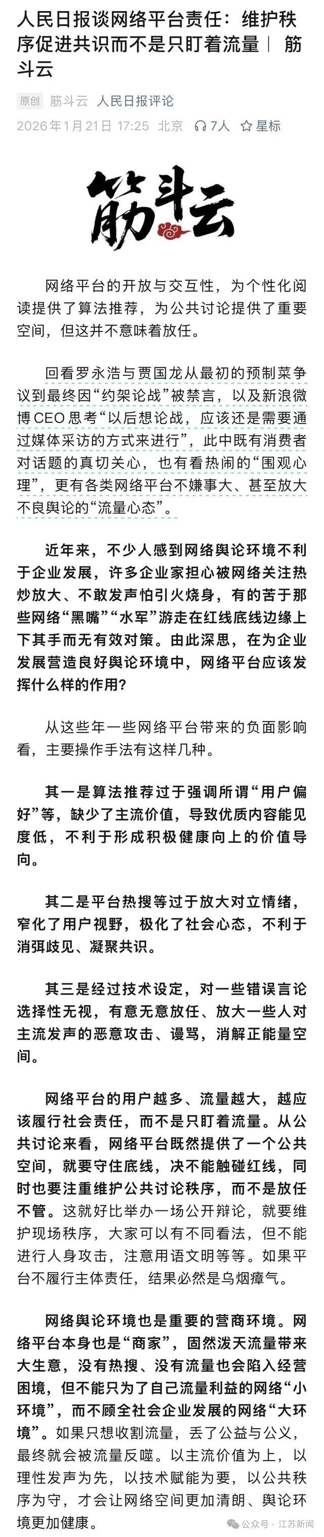 1月21日,人民日报再发评论《人民日报谈网络平台责任:维护秩序促进共识而不是只盯着流量》。