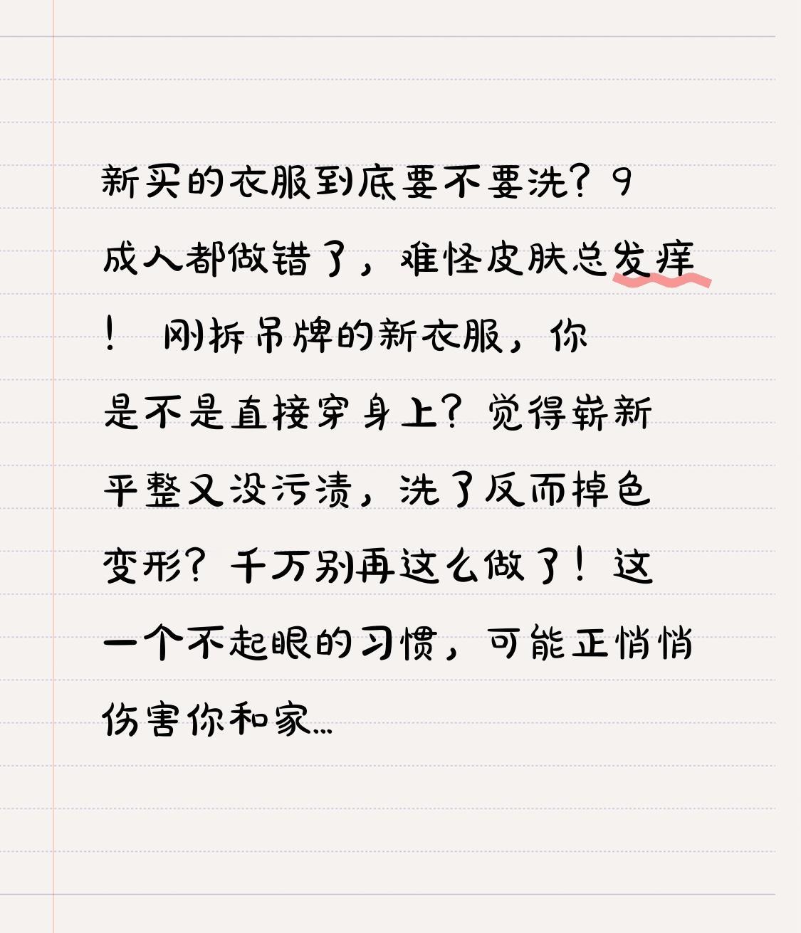 新买的衣服到底要不要洗?9成人都做错了,难怪皮肤总发痒! 刚拆吊牌的新衣服,你是不是直接穿身上?觉得崭新平整又没污渍,洗了反而掉色变形?千万别再这么做了!这一个不起眼的习惯,可能正悄悄伤害你和家人的皮肤! 不管是商场专柜买的品牌衣,还是网购的网红款,哪怕是贴身的内衣、孩子的衣服,刚到手就穿的人真的太多了。总觉得新衣服出厂都是干净的,更何况很多衣服标注“可直接穿着”,洗了还会影响版型和颜色,索性直接上身,殊不知这背后藏着不少健康隐患。 这里藏着关键的转折点:新衣服的“干净”只是表面,看似崭新的衣物,从生产到你手中,早已经过了无数道“污染关”。衣服在工厂裁剪、缝制、印染时,会接触机器油污、染料残留,还有大量工人的手汗和接触;运输和仓储过程中,会堆在仓库角落、挤在快递箱里,落灰不说还可能滋生螨虫;甚至摆上货架后,会被无数顾客摸过、试穿过,这些看不见的细菌和化学残留,全藏在衣物纤维里。 尤其是贴身的T恤、内衣、袜子,还有孩子的衣服,直接穿极易引发皮肤瘙痒、红疹,敏感肌人群反应会更明显,染料中的有害物质还可能通过皮肤进入身体,长期下来危害不小。而外套虽然不贴身,领口、袖口、口袋这些经常接触皮肤的部位,也同样藏污纳垢,洗一遍再穿才安心。 有人会担心,新衣服洗了掉色、缩水怎么办?其实只要用冷水轻柔洗,翻面清洗,不加漂白剂,大多数衣服都能保持版型,轻微掉色是正常现象,反而说明洗掉了表面的浮色和残留。比起好看,家人的健康才是最重要的。 我们总在追求生活的精致,却常常忽略这些细节。一件新衣服,洗的不是矫情,而是对自己和家人的用心。那些看似没必要的小事,恰恰是守护健康的第一道防线。 别再为了省事省略这一步了,不管多贵的新衣服,拆吊牌后先洗一遍再穿,把看不见的隐患都洗掉,穿在身上才真正踏实。 你家新衣服会直接穿还是先清洗?评论区说说你的习惯,看看有多少人踩过这个坑!