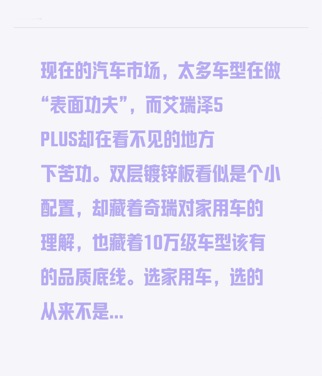 艾瑞泽5 PLUS竟用双层镀锌板?10万级家轿的良心,全在看不见的地方! 买10万级家用车,你是不是只看大屏、空间和油耗?却忽略了最影响用车寿命的关键细节?奇瑞艾瑞泽5 PLUS悄悄用了双层镀锌板,这个藏在车身里的配置,直接让它在同级别里赢麻了,懂车的人都夸这波太厚道! 相信不少人选家用车都有这误区,觉得十几万的车没必要纠结车身用料,反正开个几年就换,只要表面配置够香就行。殊不知那些看不见的地方,才是车企的良心所在。很多同价位车型为了压成本,车身用的都是普通冷轧钢板,南方开两三年车门、底盘就冒锈点,北方融雪剂一腐蚀,钣金烂得更快,后期修锈的钱比省的买车钱还多,糟心又费钱。 而艾瑞泽5 PLUS的关键转折点,就在于它在10万级这个卷到极致的价位,愣是把钱花在了车身用料这个“刀刃上”,全车60%以上的关键部位,包括前后纵梁、车门内外板、发动机舱盖,全用了双层镀锌板。这可不是简单的“加层锌”,而是钢材两面都做了热镀锌处理,形成致密的保护膜,防锈能力是普通钢板的5-8倍,梅雨季的潮湿、沿海的盐雾、北方的融雪剂,根本伤不到车身基材。 更难得的是,奇瑞还为这双层镀锌板配了全套防锈工艺:激光焊接让焊缝无缝隙,空腔注蜡形成二次防护,底盘刷PVC涂层加护板,三道涂装的漆面又把锌层牢牢保护起来。一套组合拳下来,别说开个五六年,就算十年八年,车身也不容易生锈,不仅看着新,车身结构强度也能一直在线,这才是家用车该有的扎实。 要知道,双层镀锌板每平米比普通钢板贵15-20元,整车算下来车企要多花不少成本。很多品牌宁愿把这钱花在更显眼的配置上博眼球,而艾瑞泽5 PLUS却偏偏反着来,因为它懂家用车用户的核心需求:不是一时的新鲜感,而是长期的省心。毕竟对于普通家庭来说,车是代步工具,更是陪伴家人的伙伴,车身耐用、少出毛病,才是真正的性价比。 现在的汽车市场,太多车型在做“表面功夫”,而艾瑞泽5 PLUS却在看不见的地方下苦功。双层镀锌板看似是个小配置,却藏着奇瑞对家用车的理解,也藏着10万级车型该有的品质底线。选家用车,选的从来不是一时的光鲜,而是车企把消费者的用车体验放在心上的用心。 你选车时会关注车身用料吗?身边有没有车开几年就生锈的糟心事?评论区聊聊,让更多人选车别再被表面配置迷惑!