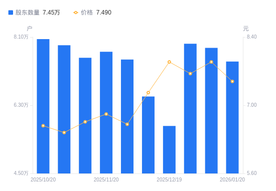 日期A股户数(户)流通A股户均持股数(股)户均持股市值(万元)2026-01-207454825907.7419.402026-01-097814624714.8919.502025-12-317925124370.2918.642025-12-195753533568.6126.492025-12-106530329575.5221.472025-11-287506125730.6717.012025-11-207711925044.0217.082025-11-107552525572.5917.032025-10-317885324493.3015.772025-10-208045524005.5915.80