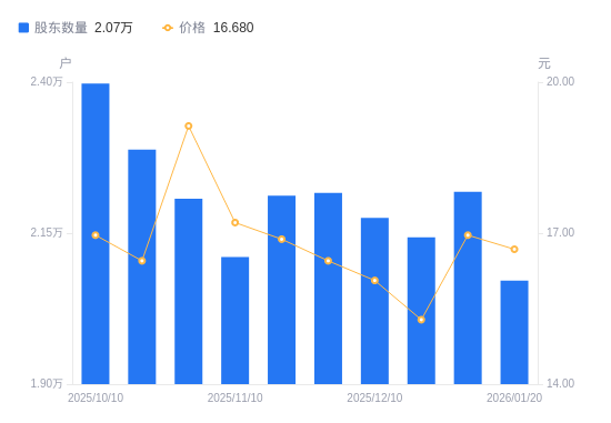 日期A股户数(户)流通A股户均持股数(股)户均持股市值(万元)2026-01-202071610130.6416.902026-01-10221839460.6816.052025-12-20214319792.6514.962025-12-10217549647.2515.492025-11-30221659468.3615.582025-11-20221209487.6216.022025-11-10211079942.9717.112025-10-31220709509.1218.192025-10-20228839171.2715.092025-10-10239788752.4514.84