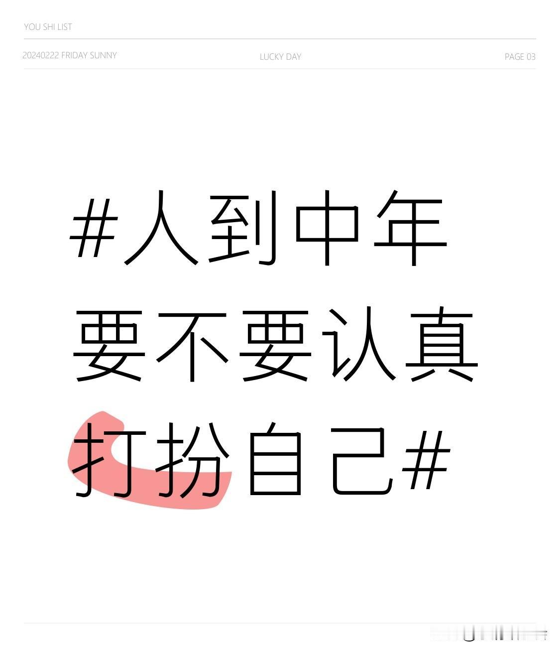 人到中年,必须认真打扮自己。很多人到中年就不再愿意打扮,头发随便扎,衣服随便穿,觉得省事。可这其实是在给生活“降气场”,精气神会跟着往下掉。在职场、社交和家庭中,人们更愿意靠近状态好的人。 打扮不是“臭美”“虚荣”,而是一种掌控感。把自己收拾利落,做事更果断,说话有底气,情绪也更稳定。 中年打扮要“少而精”,不在“变美”而在“显真”。比如不遮掩颈纹,不硬穿旧裤子。还可以把“配饰”换成“信物”,用有回忆的物品装饰自己。认真打扮,是对生活的尊重。