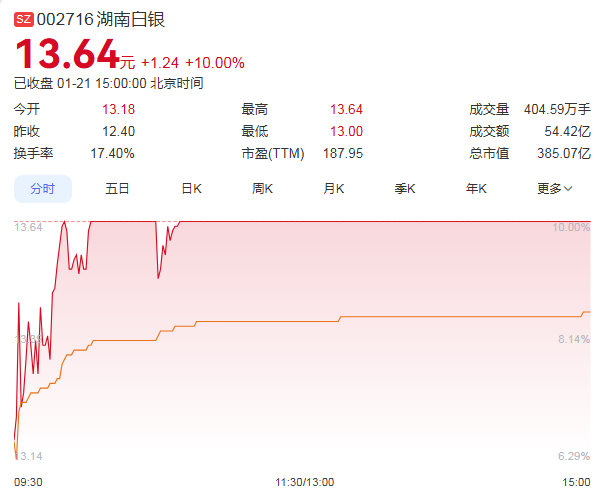 1月21日,湖南白银强势涨停,收盘价为13.64元,成交额为54.42亿元,总市值攀升至385.07亿元。据统计,自2025年12月26日以来的17个交易日内,湖南白银股价累计涨幅超过110%,表现非常亮眼。