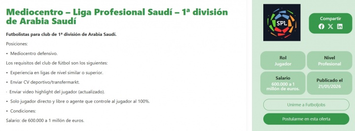 直播吧01月21日讯在足球行业招聘网站futboljobs上,一支沙特甲级联赛(二级联赛)球队发布了一则招聘启事,招聘中场球员,年薪60万到100万欧元。