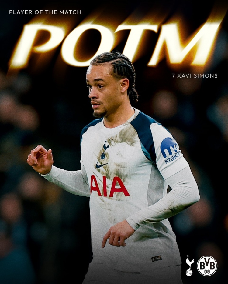 直播吧1月21日讯热刺官方宣布,哈维·西蒙斯当选2-0多特队内最佳球员。