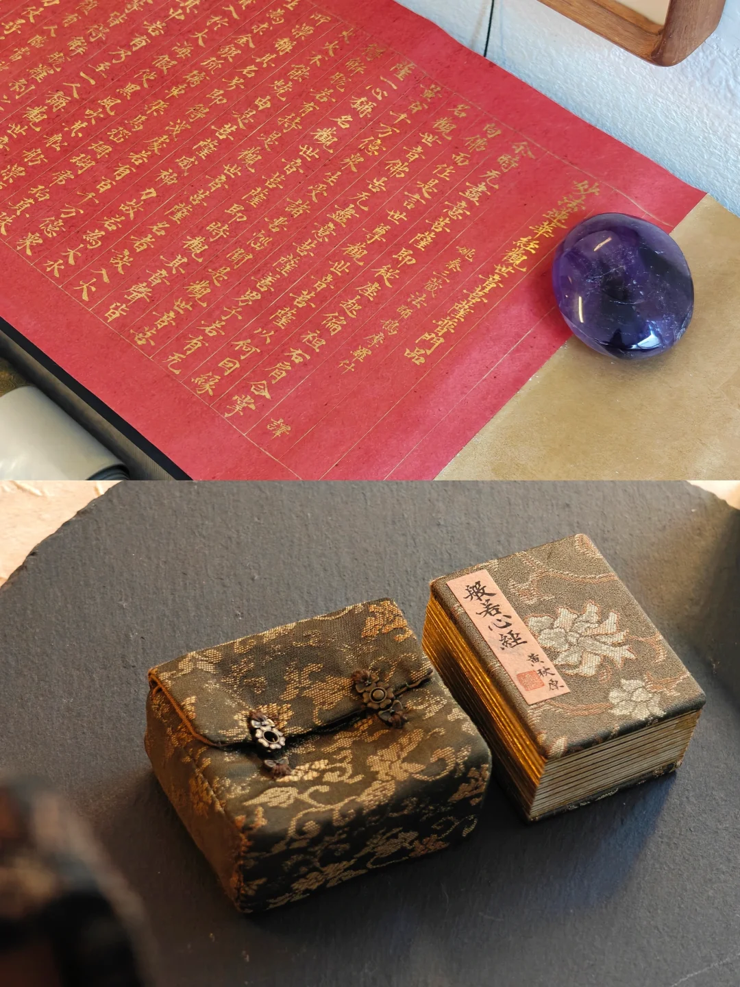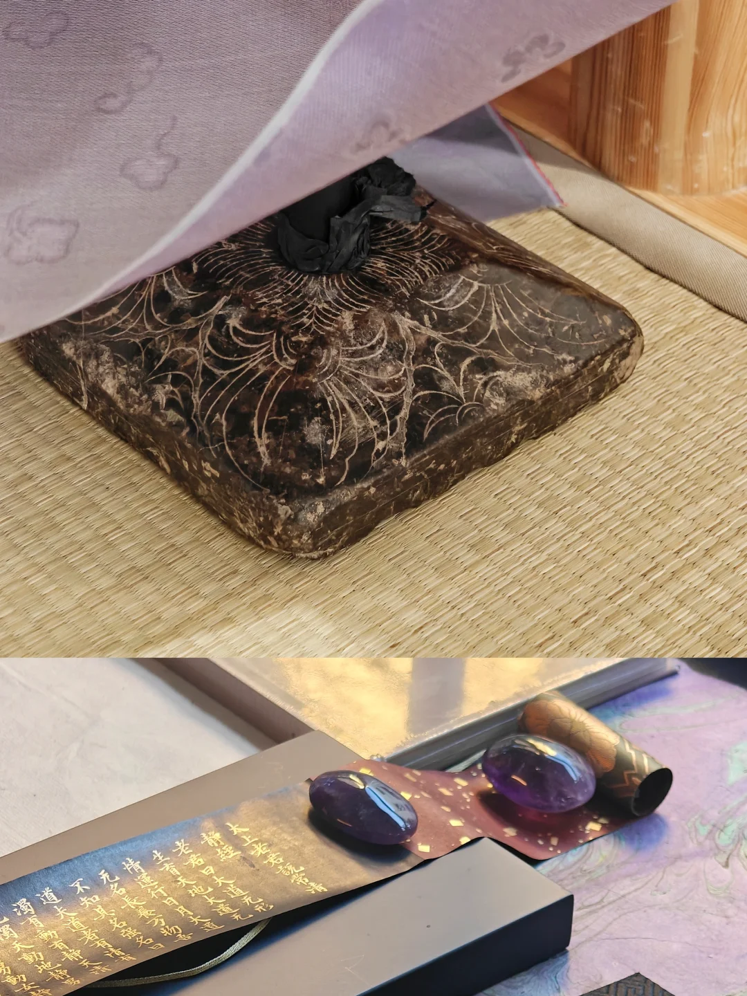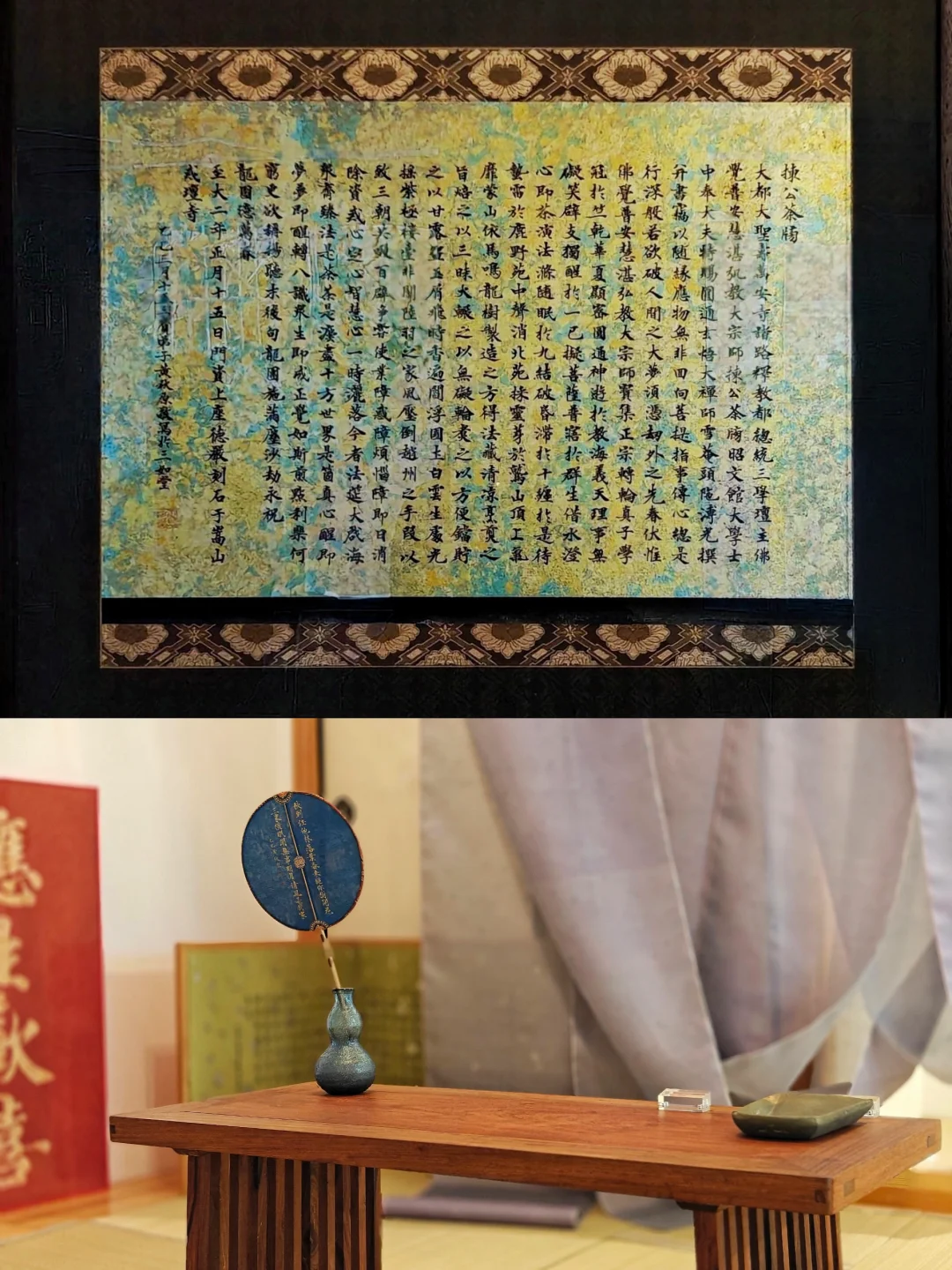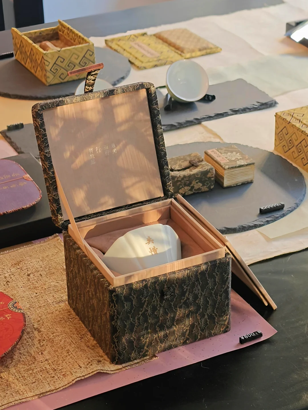 除了静态书写作品,展厅内的茶室被还原为唐时禅房的模样,唐代石质屏风底座、抄手砚等文物,与复刻的唐代栅足案、唐式经盒搭配展陈。千年前空海在长安青龙寺求法、古人伏案写经的虔敬氛围似乎离我们不再遥远。