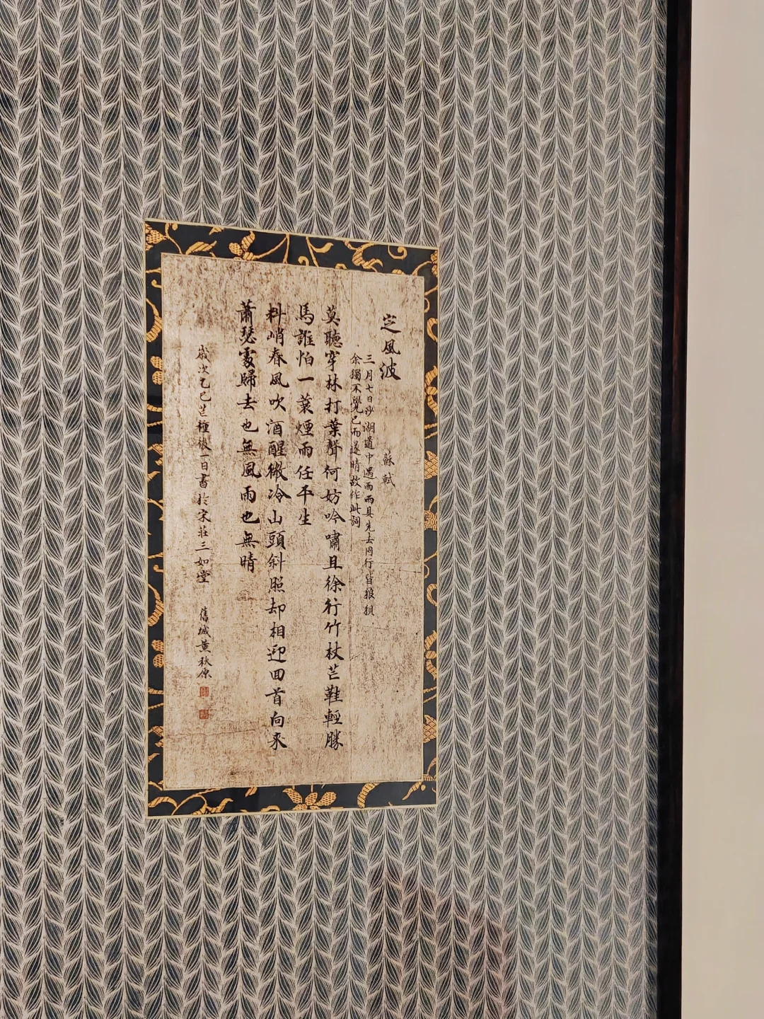 书写在百年银箔纸上,还搭配了80年前的织金锦锻装裱,古典材质和经典文本的结合极具张力。银箔纸的金属质感让“莫听穿林打叶声”的词句多了几分苍劲,织金锦锻的华美则与“一蓑烟雨任平生”的豁达形成奇妙的对比。