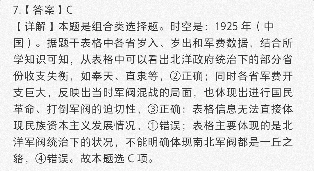 【详解】本题是组合类选择题。时空是:1925 年(中国)。据题干表格中各省岁入、岁出和军费数据,结合所学知识可知,从表格中可以看出北洋政府统治下的部分省份收支失衡,如奉天、直隶等,②正确;同时各省军费开支巨大,反映出当时军阀混战的局面,也体现出进行国民革命、打倒军阀的迫切性,③正确;表格信息无法直接体现民族资本主义发展情况,①错误;表格主要体现的是北洋军阀统治下的状况,不能明确体现南北军阀都是一丘之貉,④错误。故本题选 C 项。