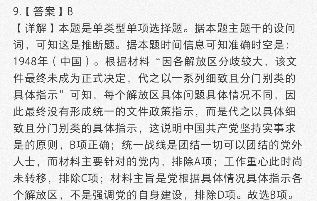 【详解】本题是单类型单项选择题。据本题主题干的设问词,可知这是推断题。据本题时间信息可知准确时空是:1948年(中国)。根据材料“因各解放区分歧较大,该文件最终未成为正式决定,代之以一系列细致且分门别类的具体指示”可知,每个解放区具体问题具体情况不同,因此最终没有形成统一的文件政策指示,而是代之以具体细致且分门别类的具体指示,这说明中国共产党坚持实事求是的原则,B项正确;统一战线是团结一切可以团结的党外人士,而材料主要针对的党内,排除A项;工作重心此时尚未转移,排除C项;材料主旨是党根据具体情况具体指示各个解放区,不是强调党的自身建设,排除D项。故选B项。