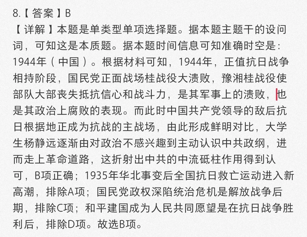 【详解】本题是单类型单项选择题。据本题主题干的设问词,可知这是本质题。据本题时间信息可知准确时空是:1944年(中国)。根据材料可知,1944年,正值抗日战争相持阶段,国民党正面战场桂战役大溃败,豫湘桂战役使部队大部丧失抵抗信心和战斗力,是其军事上的溃败,也是其政治上腐败的表现。而此时中国共产党领导的敌后抗日根据地正成为抗战的主战场,由此形成鲜明对比,大学生杨静远逐渐由对政治不感兴趣到主动认识中共政纲,进而走上革命道路,这折射出中共的中流砥柱作用得到认可,B项正确;1935年华北事变后全国抗日救亡运动进入新高潮,排除A项;国民党政权深陷统治危机是解放战争后期,排除C项;和平建国成为人民共同愿望是在抗日战争胜利后,排除D项。故选B项。