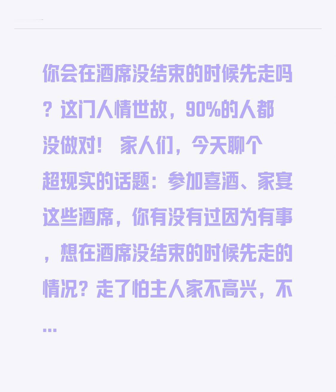 你会在酒席没结束的时候先走吗?这门人情世故,90%的人都没做对! 家人们,今天聊个超现实的话题:参加喜酒、家宴这些酒席,你有没有过因为有事,想在酒席没结束的时候先走的情况?走了怕主人家不高兴,不走自己又实在熬不住,左右为难的滋味,估计很多人都尝过!今天就跟大家唠唠这酒席上的人情世故,看完再也不用纠结,还能做个懂礼数的人! 逢年过节、婚丧嫁娶,酒席就是咱中国人的人情场,讲究的就是个热闹和礼数。可现实里,谁还没个急事?可能是家里孩子没人看,可能是临时要加班,也可能是身体不舒服撑不住,想提前离席太正常了。但身边不少朋友都踩过坑,要么一声不吭偷偷走,回头让主人家心里膈应;要么大声嚷嚷着要走,弄得全桌人都尴尬,好好的酒席,愣是因为这小事落了话柄。 大家总觉得,酒席没结束提前走,就是不给主人家面子,其实真不是这样,这就是最关键的转折点:酒席上提前走不可怕,不懂礼数的走法,才最容易得罪人! 主人家办酒席,图的是大家开心、图的是礼数周到,只要你做到有始有终、礼貌告辞,哪怕提前走,主人家不仅不会生气,还会觉得你是个懂规矩的人。那些让人不舒服的,从来不是“提前走”这个行为,而是毫无交代的敷衍和不懂事的做法。 今天就教大家两个酒席提前离席的万能礼数,简单又实用,记牢了不吃亏!第一,单独找主人家告辞,别在酒桌上大喊大叫,走到主人身边,小声说句“哥/姐,实在不好意思,家里有点急事得先回去了,今天招待得太周到了,辛苦你了”,简单几句话,诚意到了,主人家绝对能理解;第二,和同桌的人打个招呼,毕竟一桌人喝了半天酒,简单说句“各位慢吃,我有点事先走了,你们尽兴”,基本的礼貌做到位,不扫大家的兴。 千万别做这两种事:一是偷偷溜掉,主人家回头发现少了人,还以为你吃得不开心,心里准不舒服;二是当着所有人的面说“这酒喝得没意思,我先走了”,这话一出口,不光主人家下不来台,同桌的人也会觉得你没素质。其实办酒席的人都懂,每个人都有自己的事,只要礼数到了,所有的离开都能被理解。 说到底,酒席上的人情世故,从来都不是死板的规矩,而是藏在细节里的尊重。一杯酒、一句话、一个简单的告别,都是对别人的用心,也是咱中国人最看重的情分。无论是办酒席的主人,还是赴宴的客人,互相理解、彼此尊重,这酒席才吃得舒心,人情才处得长久。 家人们,你们有没有过酒席提前离席的经历?评论区说说你是怎么做的,还有哪些酒席上的小礼数,咱们一起聊聊!觉得这些小技巧实用的,点赞收藏转发,让更多人做个懂礼数、会做人的聪明人!