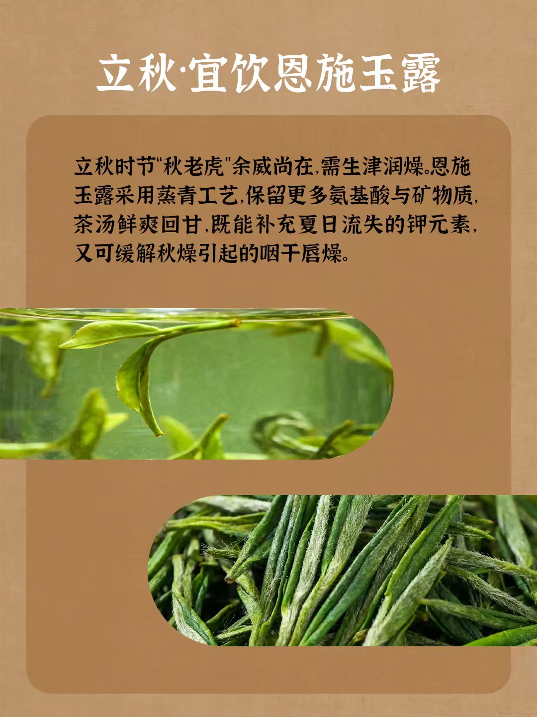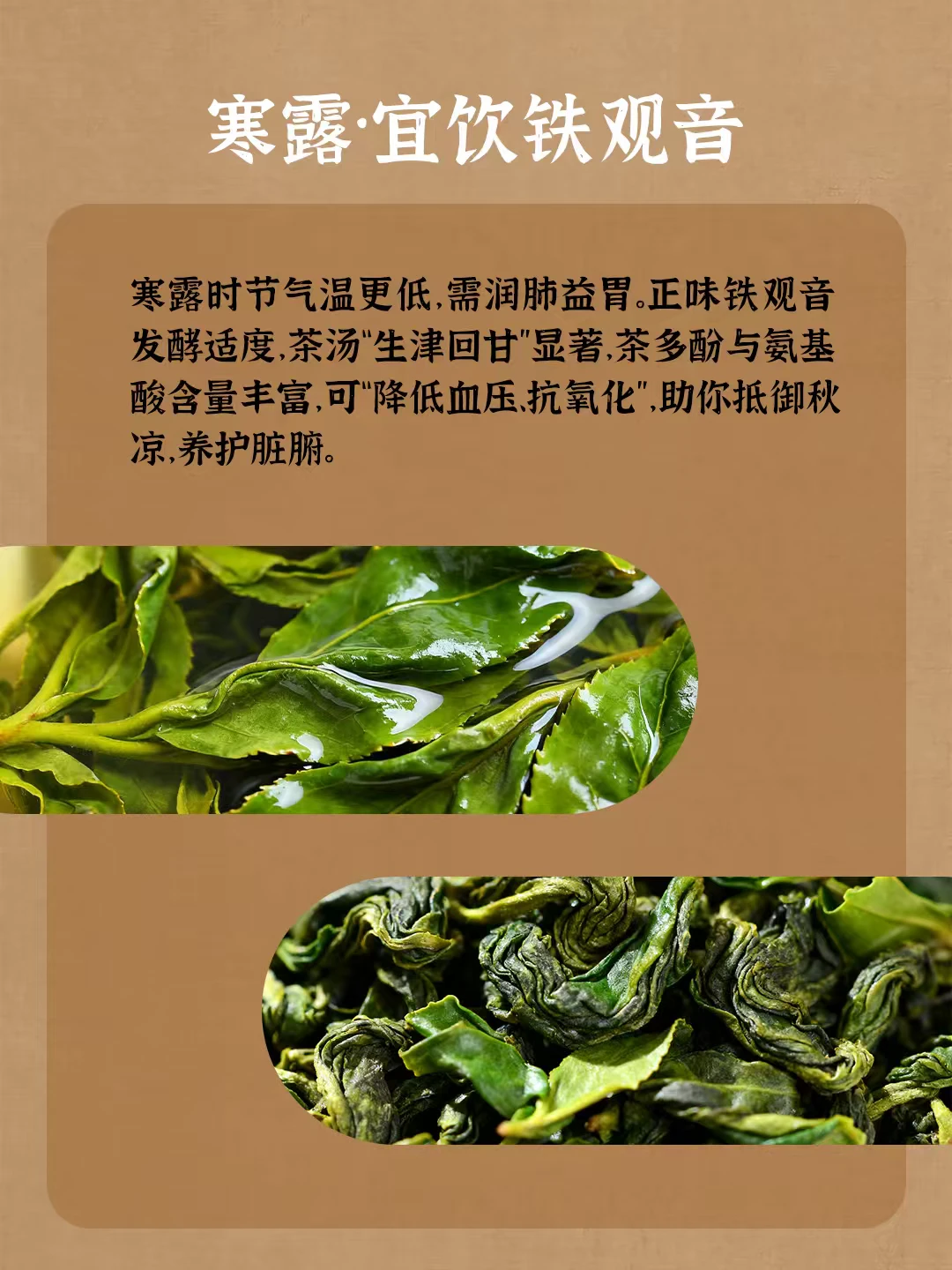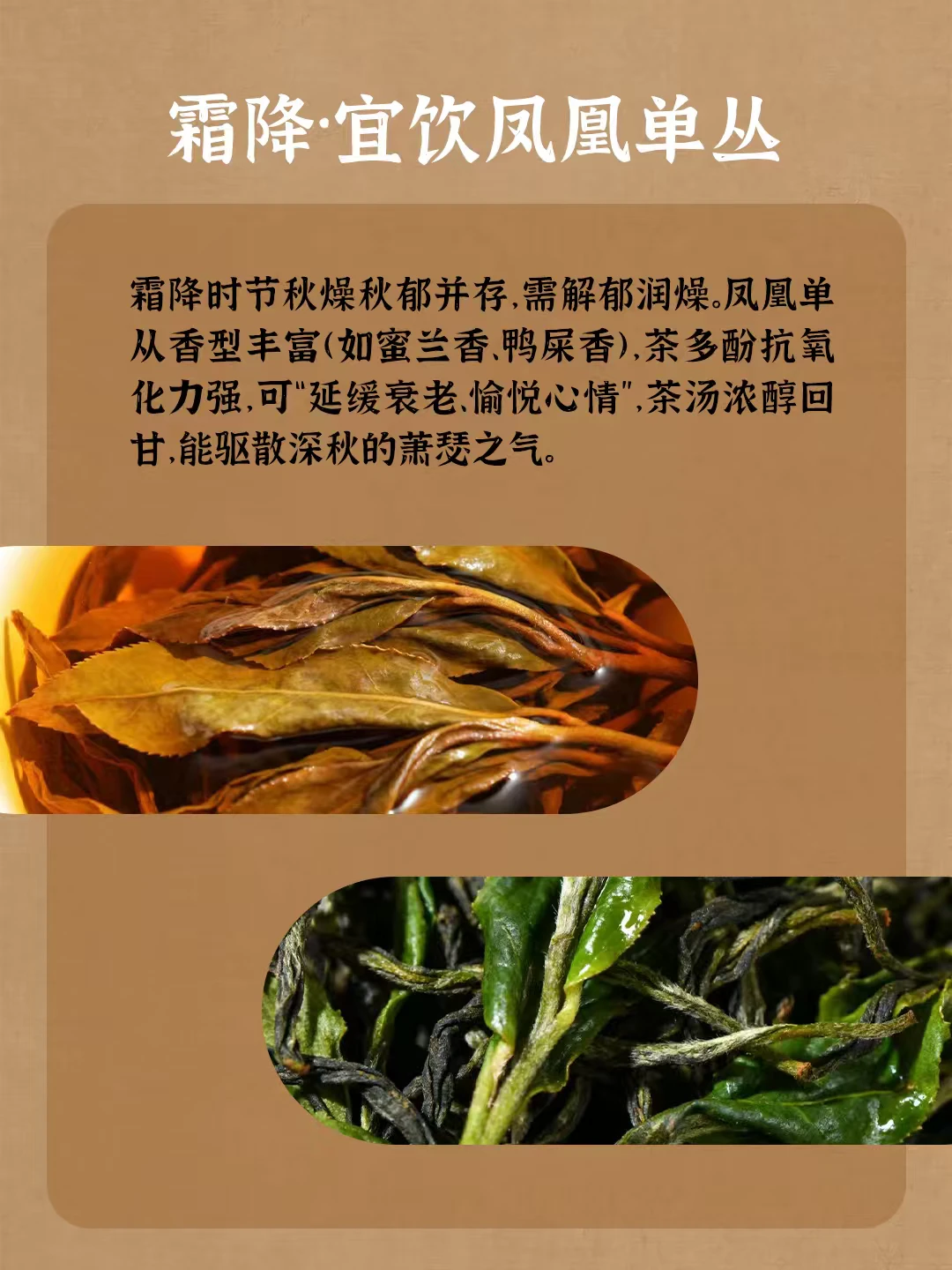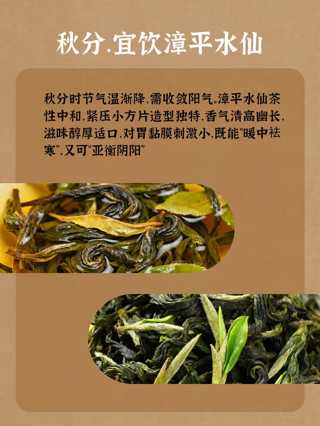 二十四节气代表着气候的变化 春干秋燥、夏暑冬寒 不仅影响着农事的安排 与茶饮健康,亦是密切相关 从春茶到秋茶 不同节气赋予它们各自的滋味和使命 一杯时令好茶 可让身体跟上自然变化的节拍 春干秋燥、夏暑冬寒 不仅影响着农事的安排 与茶饮健康,亦是密切相关