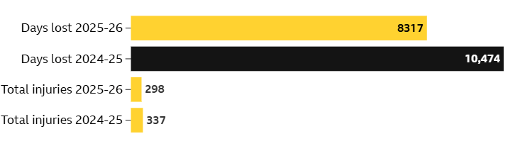 总体而言,与上赛季同期相比,英超球队累计因伤损失的天数减少了2157天。不过,通过对整个赛季的数据分析发现,某些常见伤病的严重程度似乎正在增加。