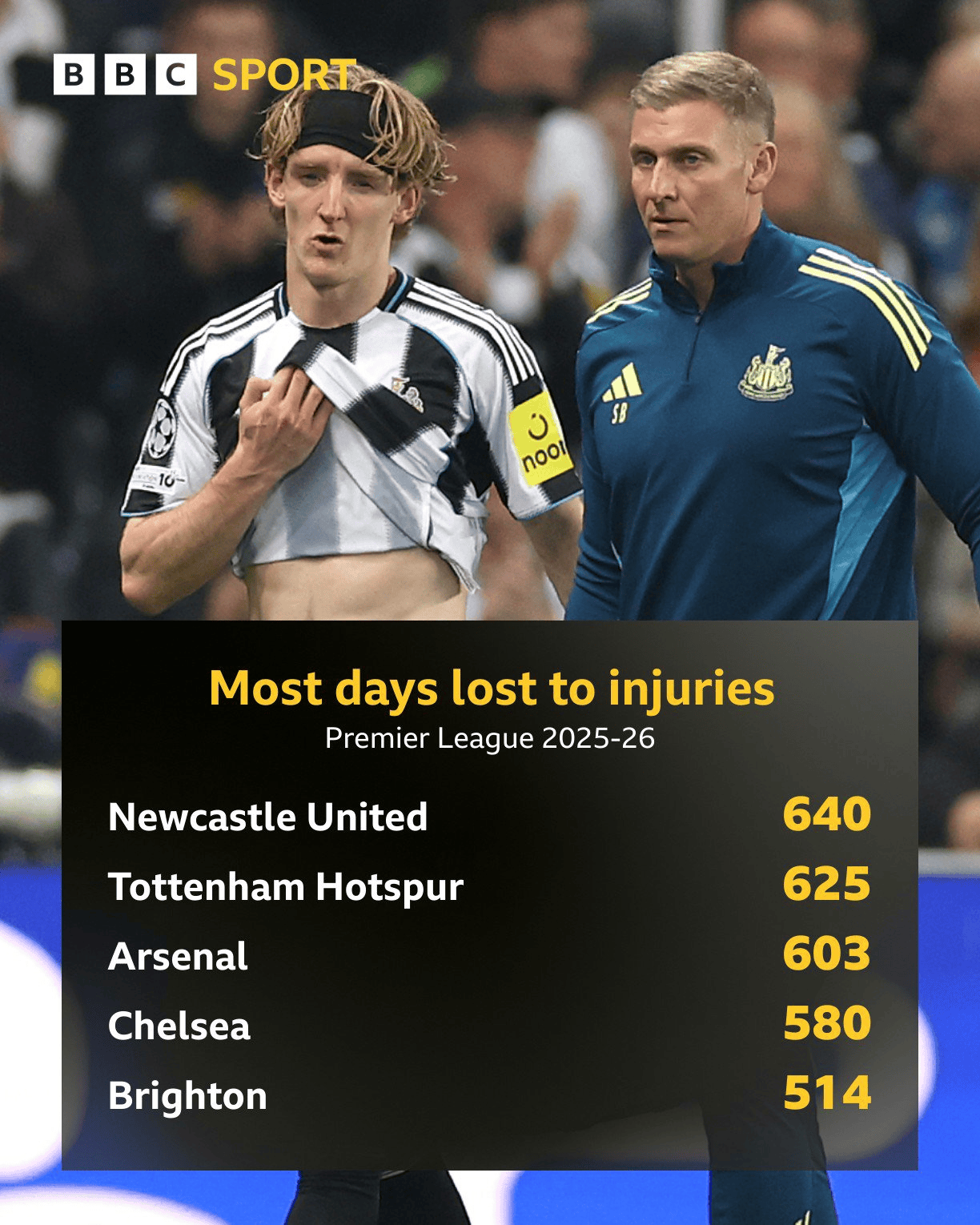 周五午餐时间,英超联赛的新闻发布会正在火热进行中——随后传出消息,一名关键球员因伤将缺席一场至关重要的比赛。虽然这对每位主教练来说都是司空见惯的事,但数据显示,本赛季某些球队受到的影响明显超过其他球队,这其中就包括正处于压力之下的热刺主帅托马斯-弗兰克。