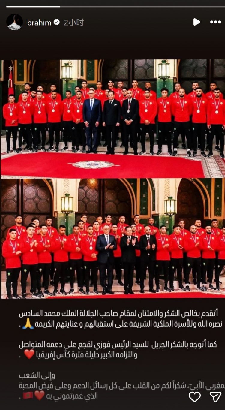 获得非洲杯亚军!摩洛哥国王接见国家队,迪亚斯社媒晒照致谢