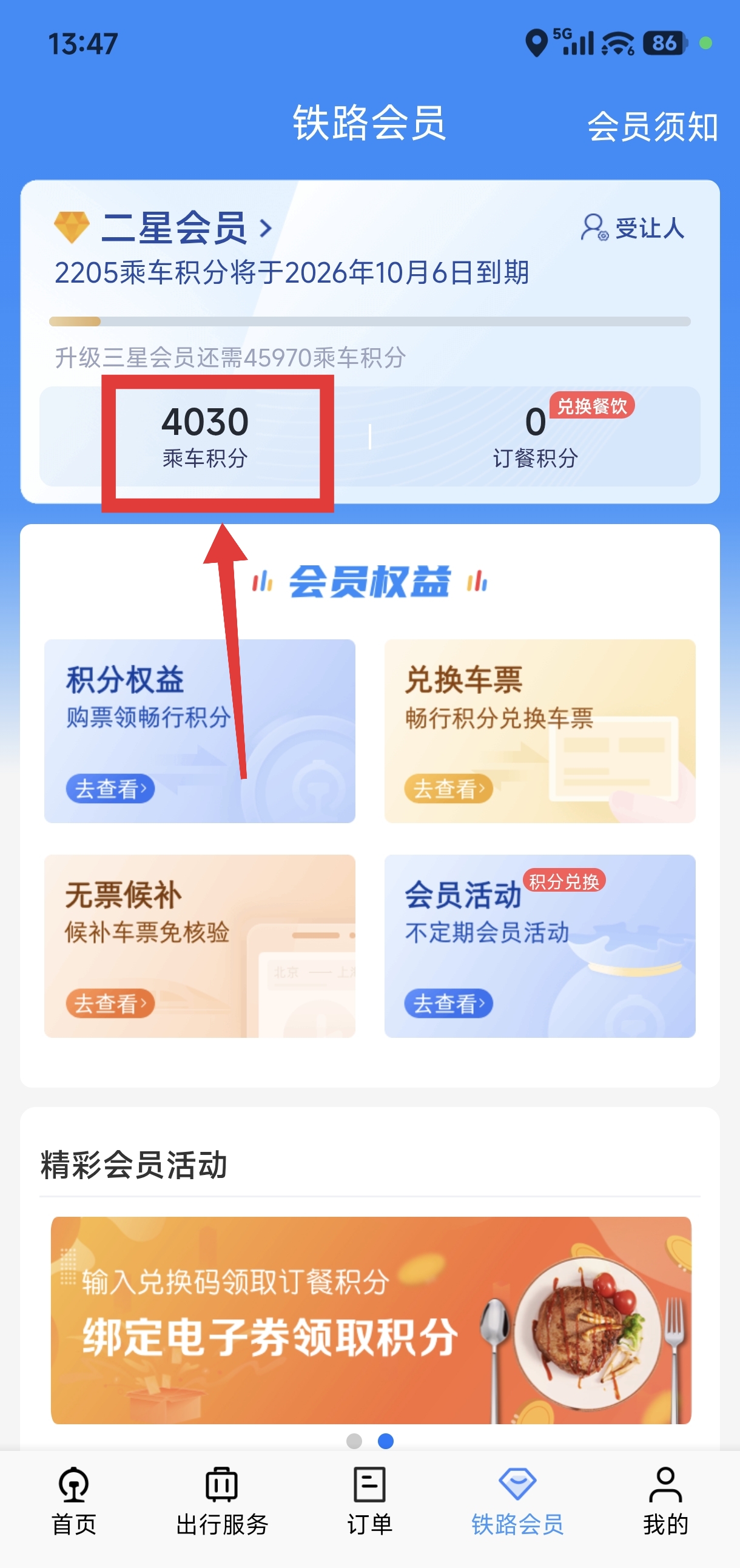 首先打开铁路12306的主页面,然后点击:铁路会员。2.进入到铁路会员页面后,点击:乘车积分。3.最后进入到我的积分页面