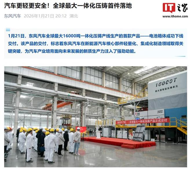 IT之家1月22日消息,据东风汽车官方昨日分享,1月21日,东风汽车全球最大16000吨一体化压铸产线生产的首款产品——电池箱体成功下线交付。