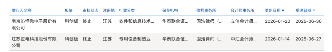 记者从上交所官网获悉,1月20日,沁恒微的科创板IPO审核状态更新为“终止”。而此前1月14日,亚电科技科创板IPO已率先终止。由此,2026年以来,A股IPO终止案例已达到2家。记者发现,上述两家公司IPO终止原因均是发行人及保荐机构撤回IPO申请。