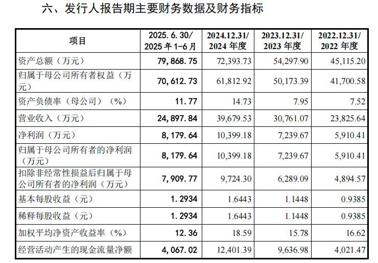财务数据显示,2022年度、2023年度、2024年度和2025年1-6月,沁恒微的营业收入分别为2.38亿元、3.08亿元、3.97亿元和2.49亿元;归母净利润分别为5910.41万元、7239.67万元、1.04亿元和8179.64万元。公司选择科创板第一套上市标准申报上市。